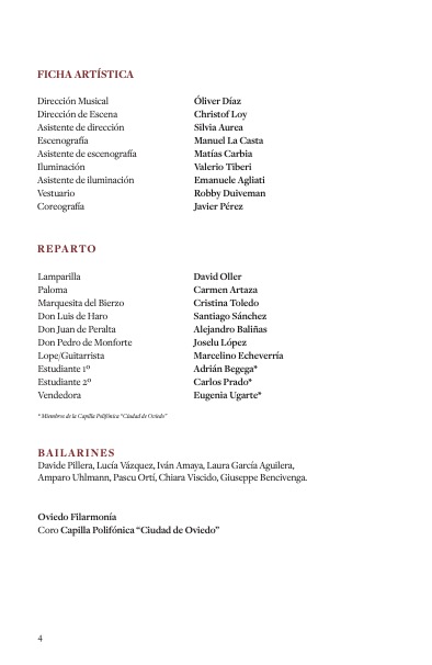 Lamparilla: David Oller – Paloma: Carmen Artaza – Marquesita del Bierzo: Cristina Toledo – Don Luis de Haro: Santiago Sánchez – Don Juan de Peralta: Alejandro Baliñas – Don Pedro de Monforte: Joselu López – Lope/Guitarrista: Marcelino Echeverría – Estudiante 1º: Adrián Begega* – Estudiante 2º: Carlos Prado* – Vendedora: Eugenia Ugarte*.