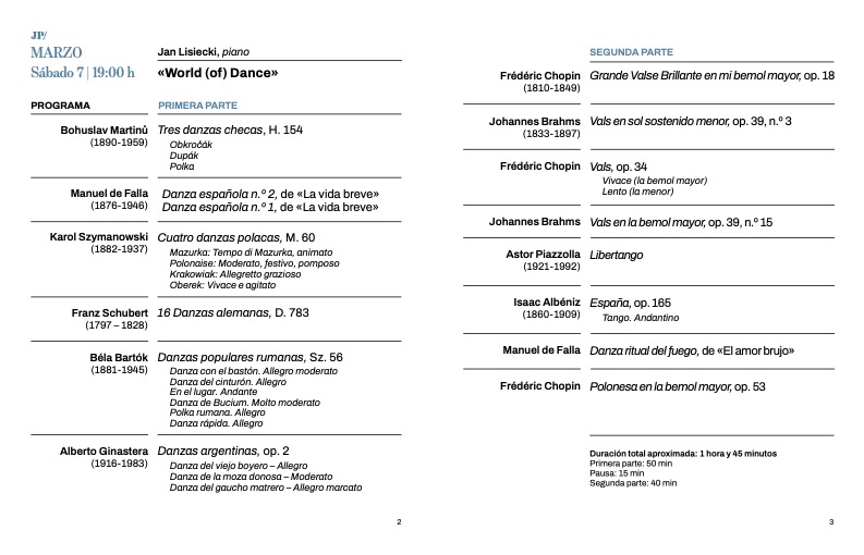 Sábado 7 de marzo, 19:00 horas. Auditorio de Oviedo, Jornadas de Piano “Luis G. Iberni”. Jan Lisiecki (piano): «World (of) Dance». Obras de Martinů, Falla, Szymanowski, Schubert, Bartók, Ginastera, Chopin, Brahms, Piazzolla y Albéniz.