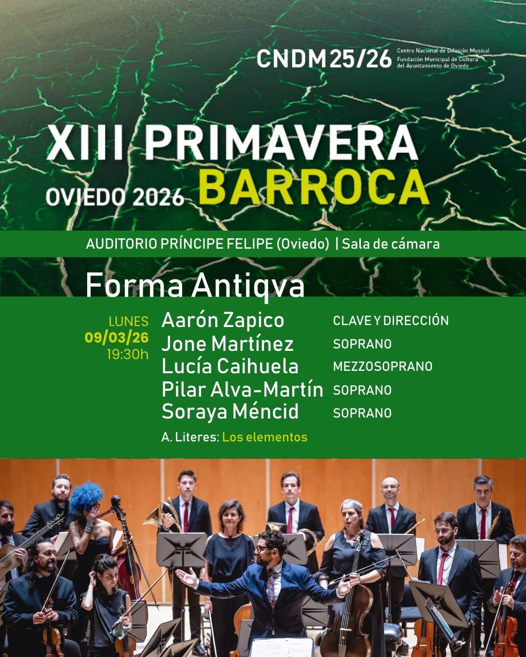 El Barroco goza de buena salud entre un público de todas las edades, y Oviedo llega a su decimotercera edición de este ciclo, en colaboración con el CNDM (Circuitos Oviedo), con todo vendido (por lo visto y leído ahora se dice «Sold Out») en este primer concierto que traía a los asturianos de Forma Antiqva bajo la dirección de Aarón Zapico y un elenco de voces femeninas, con las que lleva tiempo trabajando en distintos proyectos, que pusieron sobre las tablas la calificada como “ópera armónica al estilo italiano”, Los elementos (ca. 1705), del mallorquín Antoni Literes i Carrió (Artà, 1673-Madrid, 1747), una puesta en escena que ya realizasen los asturianos en la Fundación Juan March en abril de 2018 bajo la dirección escénica e iluminación de Tomás Muñoz.