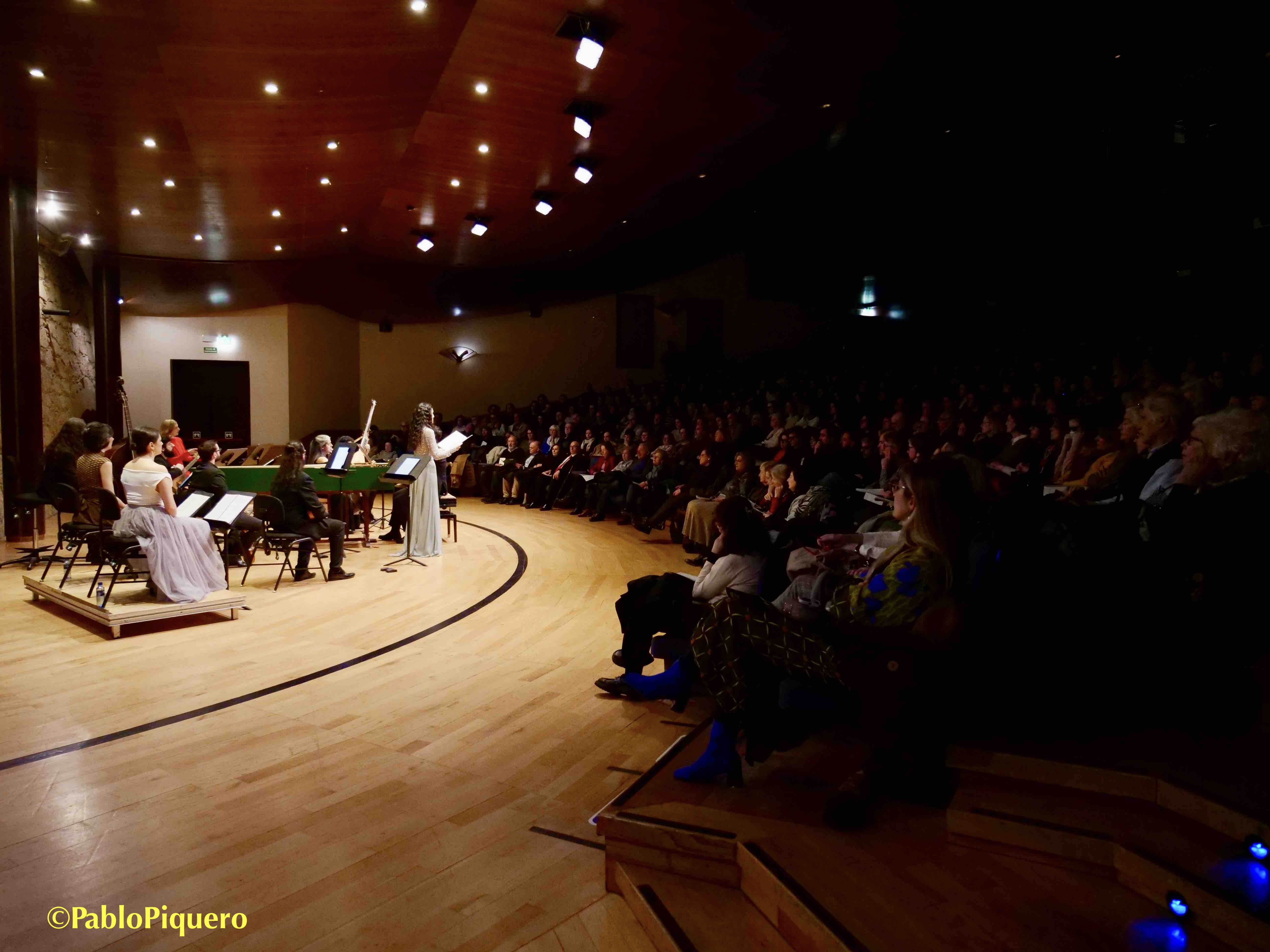 Las cuatro voces femeninas para esta «ópera armónica al estilo italiano» (no al completo por plantilla que se ampliaría de hacerse «al pie de la letra» como bien explicó el maestro Aarón en la clase previa), fueron un acierto por la elección, de colores y caracteres bien diferenciados, ubicadas a pares atrás escoltando al ensamble (Aire y Tierra más Fuego y Agua) para bien cantar desde sus posiciones o transitar por las tablas de una Sala de Cámara de acústica ideal para estos repertorios, casi la segunda casa de los langreanos, que sin interrupción alguna hicieron las delicias de un heterogéneo y entregado público.