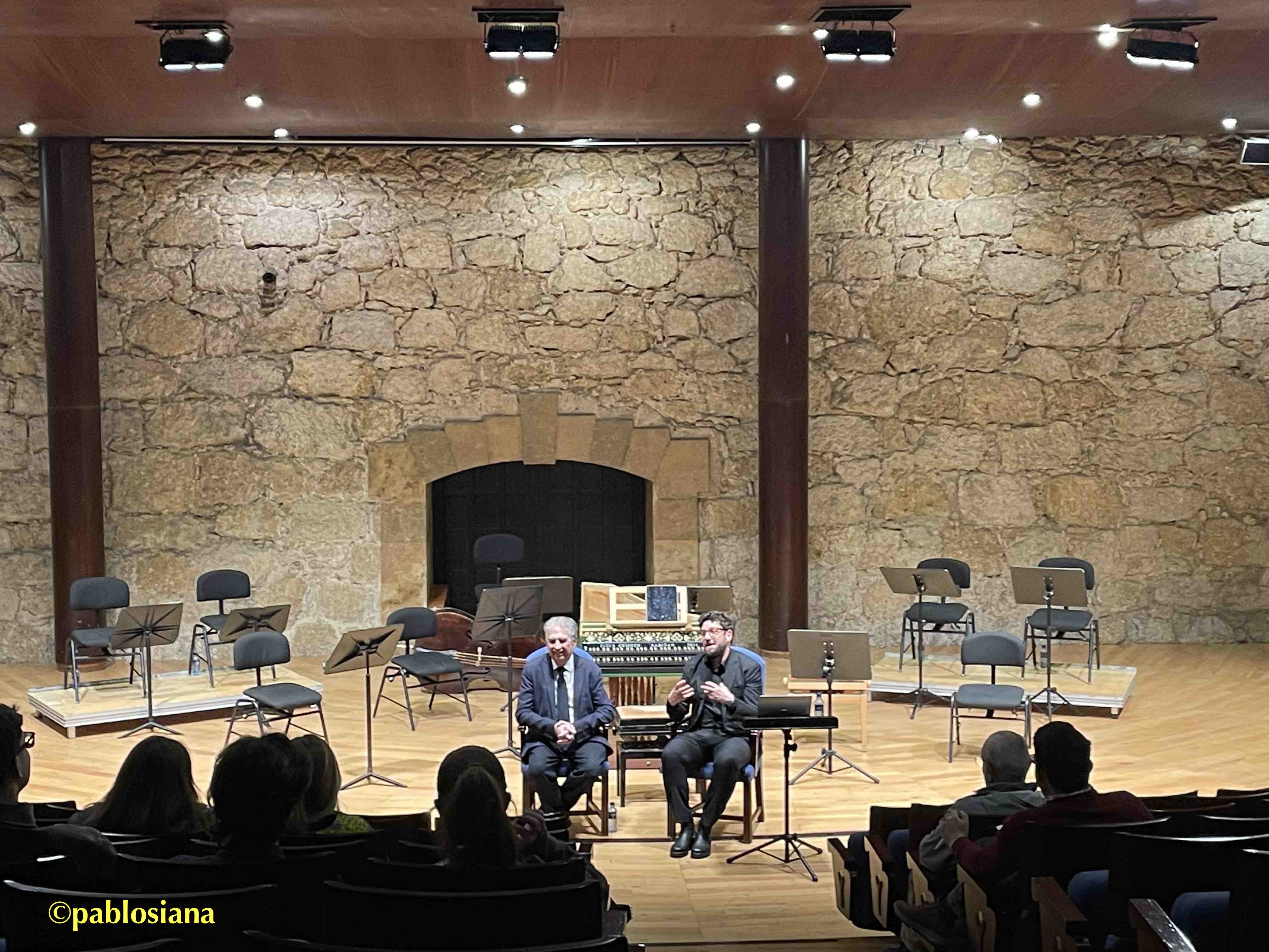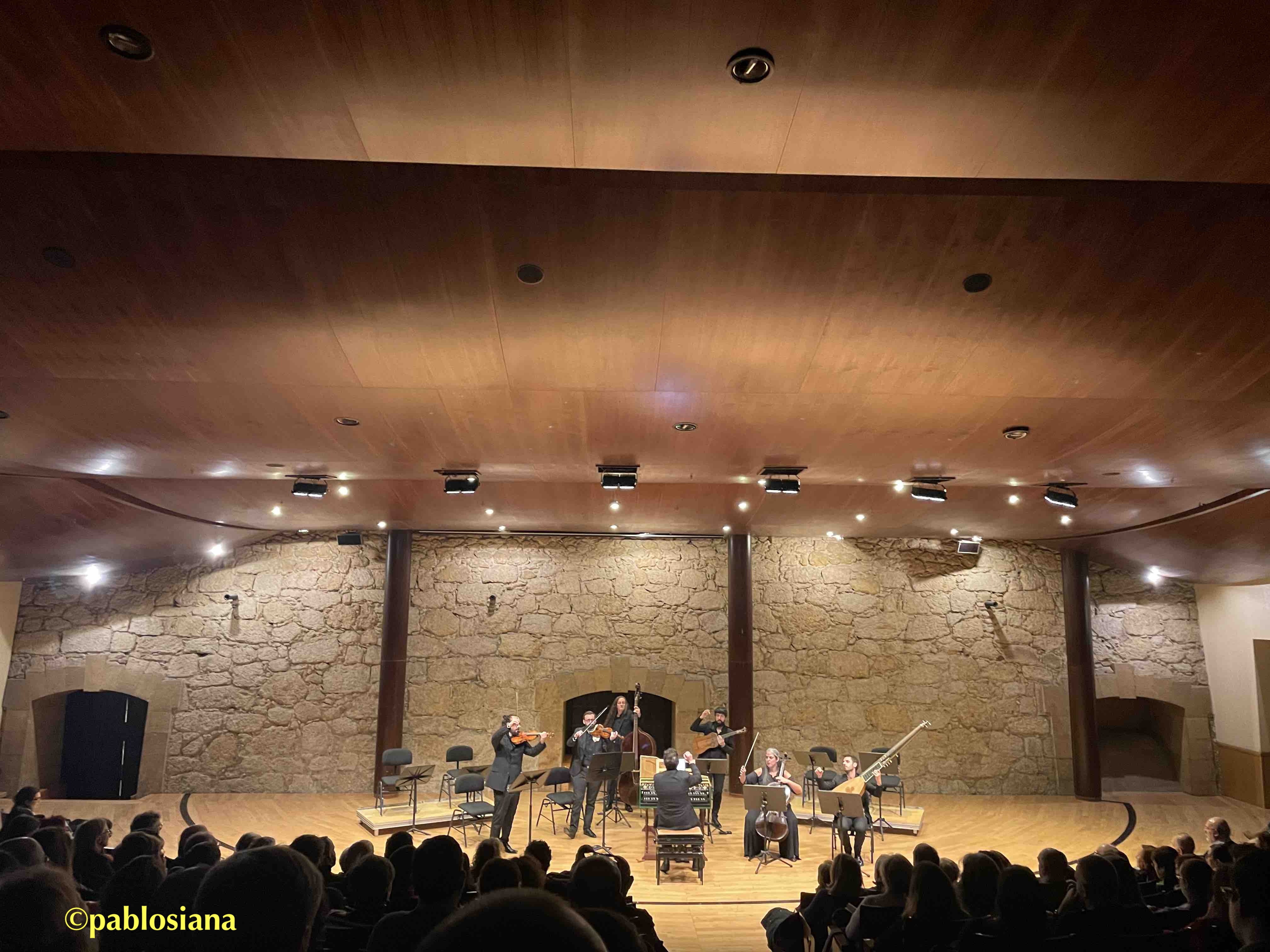 La escritura del compositor mallorquín, bien explicada en la conferencia previa (habrá que animar al alumnado a no perdérselas) a las 18:00 horas por el doctor Ramón Sobrino y Aarón Zapico exige «bucear» en todos los detalles, y la interpretación de Forma Antiqva, buenos conocedores de estas «cantadas hispanas», se ciñó a cada uno de los 36 números con puentes instrumentales -de Corelli, Basset, José de Torres o Gaspar Sanz- muy bien enlazados por parte de los hermanos Zapico (primorosa la guitarra barroca de Pablo pese a una «incidencia» no prevista por parte de una señora algo desorientada) o el violín de Jorge Jiménez, también una sabia elección del acompañamiento ideal para cada solo, con «dúos» entre voz y cello (Ruth «Zapico») que cantaron cada frase en la misma dirección, con el orgánico básico de unos músicos que conforman el «núcleo duro» e imprescindible de los asturianos con Aarón en un clave siempre ornamentando o completando cada página.