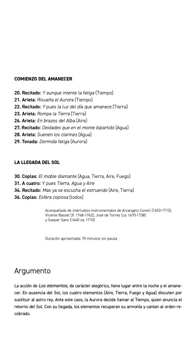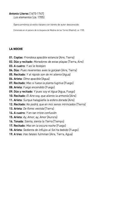 Alternancia de voces con un bajo continuo dialogando o sustentando arietas, o los tutti siempre bien controlados en las dinámicas por Aarón Zapico. «La noche» finalizaba A tres con Aire, Tierra y Agua, «Iras fatales fulminan» sin apagar el Fuego previo antes que el Tiempo anunciara el «Comienzo del Amanecer»: