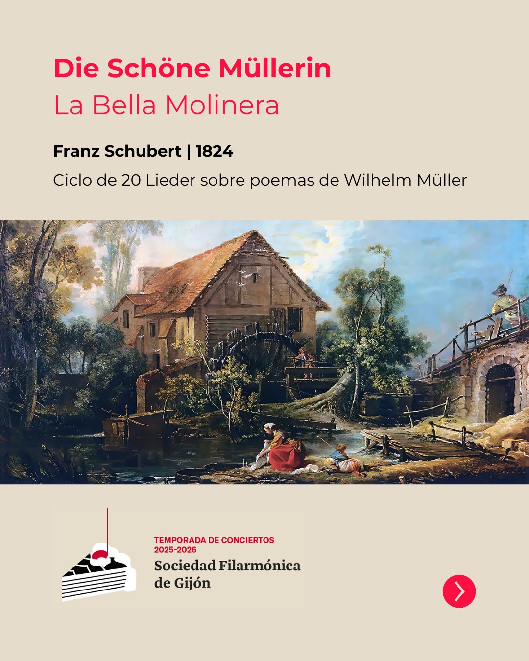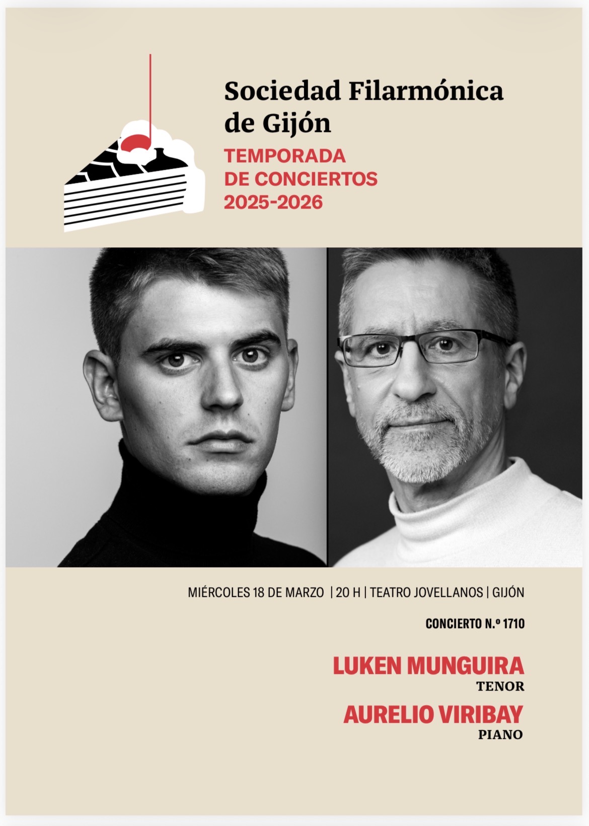 Miércoles 18 de marzo, 20:00 horas. Teatro Jovellanos, Sociedad Filarmónica de Gijón: Concierto 1710 (en colaboración con el POEX26): Luken Munguira (tenor), Aurelio Viribay (piano). Schubert: «La bella molinera» (Die schöne Müllerin, D 795).