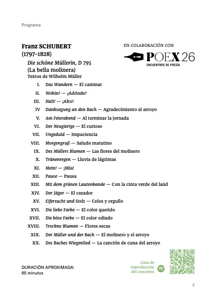 A Gijón el dúo Munguira-Viribay llegaban dentro de los Encuentros de Poesía (POEX) nada menos que con este ciclo Die schöne Müllerin, D 795 (1823). Toda una prueba de fuego que tanto el joven tenor como el reconocido maestro y pianista lograron el respeto de un público que seguiría la proyección de los textos traducidos a partir de los veinte poemas que Schubert elige de los veinticinco que Wilhelm Müller de Dessau (1794-1827) publica en 1821: la primera parte de la colección «Sieben und siebzig Gedichten aus den nachgelassenen Papieren eines reisenden Waldhornisten» (en traducción de Adriana Hochleitner de Vigil para el citado libro de Fischer-Dieskau sería «Poemas de los papeles dejados por una corneta del bosque itinerante») con el subtítulo «Para leer en el invierno», perfecta conjunción a las puertas de la primavera, poemas donde existe aún ironía suave y escondida, incluso la modestia donde algunos números entrelazados (caso de los números XIII y XIV) constituyen todo un ciclo.