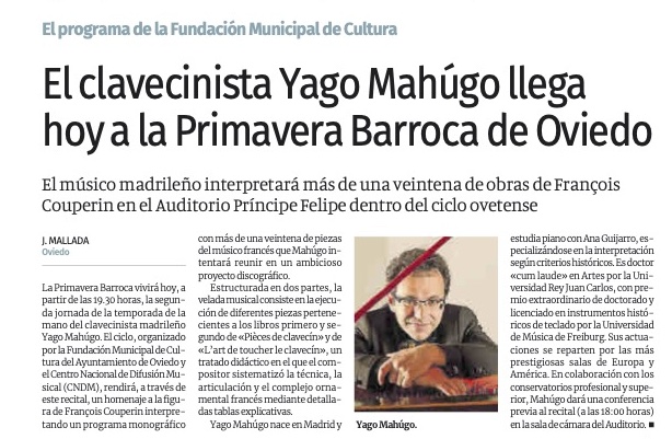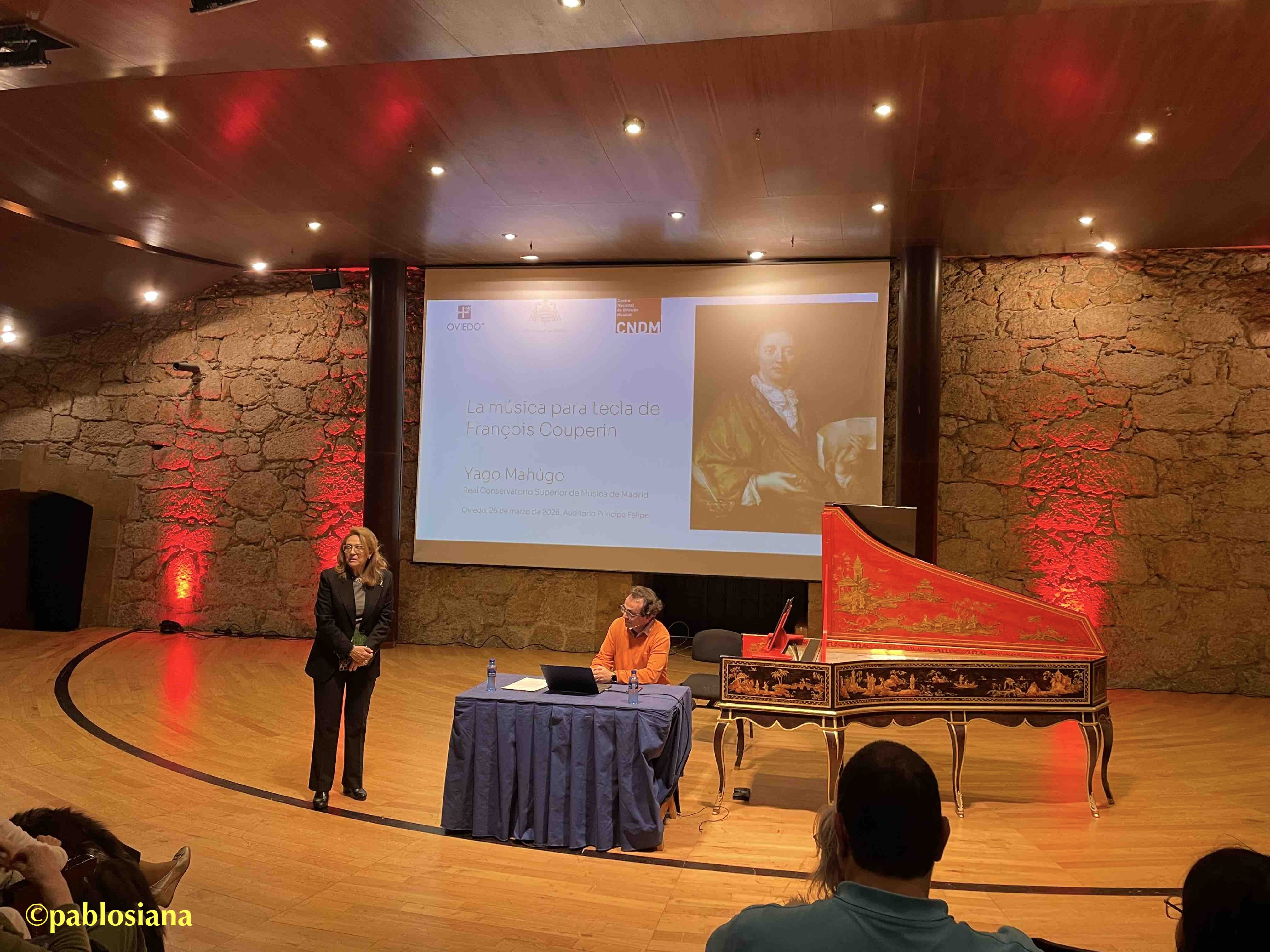 Hace ya once años que el clavecinista Yago Mahúgo (Madrid, 1976) visitaba esta Primavera Barroca con su grupo Ímpetus, un músico de tecla e investigador al que tuve la suerte de escucharlo el pasado verano en Granada al pianoforte. Pero esta vuelta a Oviedo nos le traería al clave con la conferencia previa a las 18:00 horas (integradas dentro de esta programación, en colaboración con el CONSMUPA y la Universidad de Oviedo), presentado por la doctora Mª Encina Cortizo donde acercar y enseñarnos no solo su bellísimo clave (una réplica del Taskin -1769- realizada en 2009 por el luthier Keint Hill, propiedad del propio Mahúgo) sino cómo es su acercamiento a la obra de François Couperin, desgranando muchas de las obras que escucharíamos posteriormente en una sala llena que sigue demostrando el tirón que este ciclo tiene entre los melómanos asturianos.