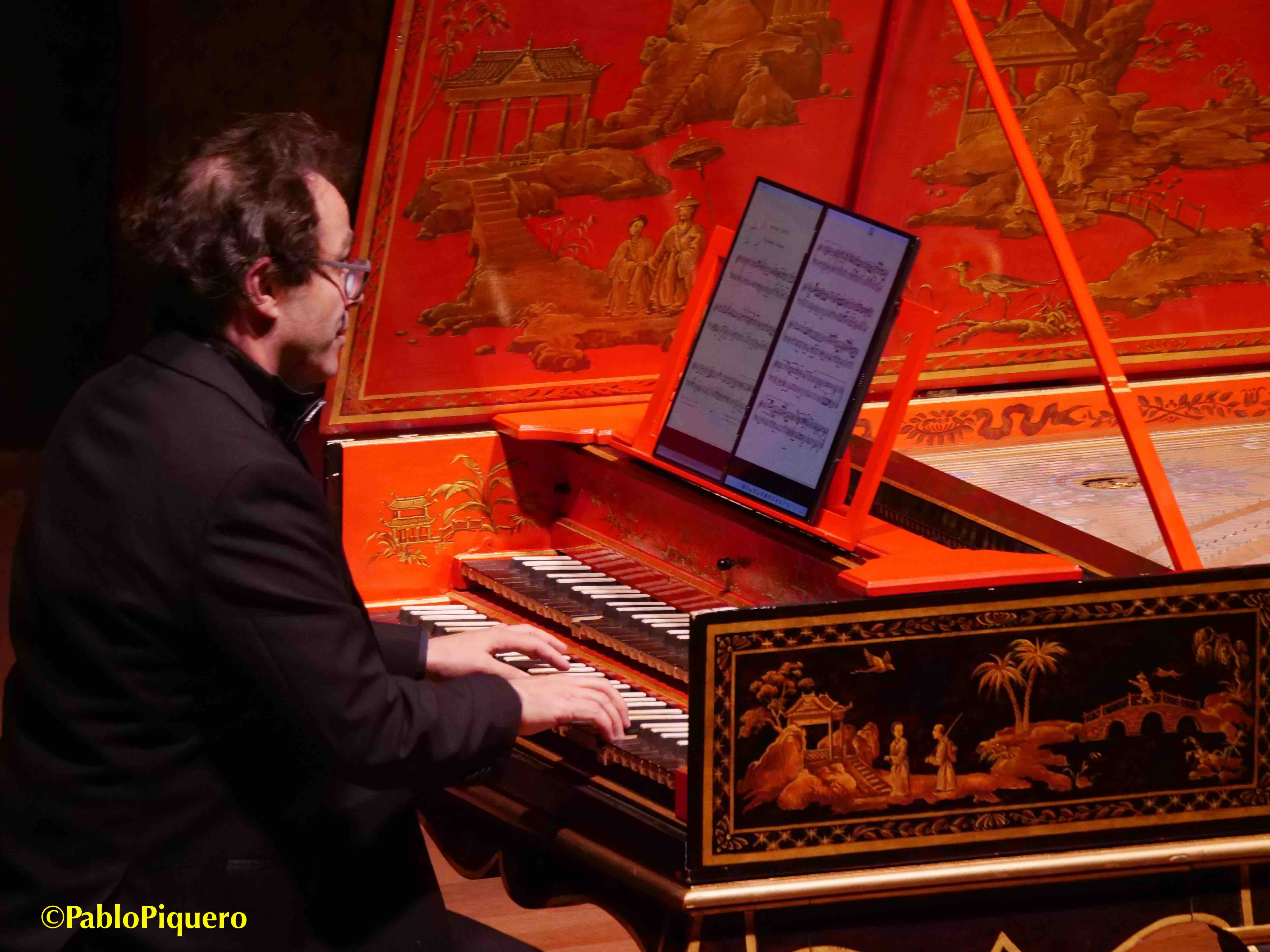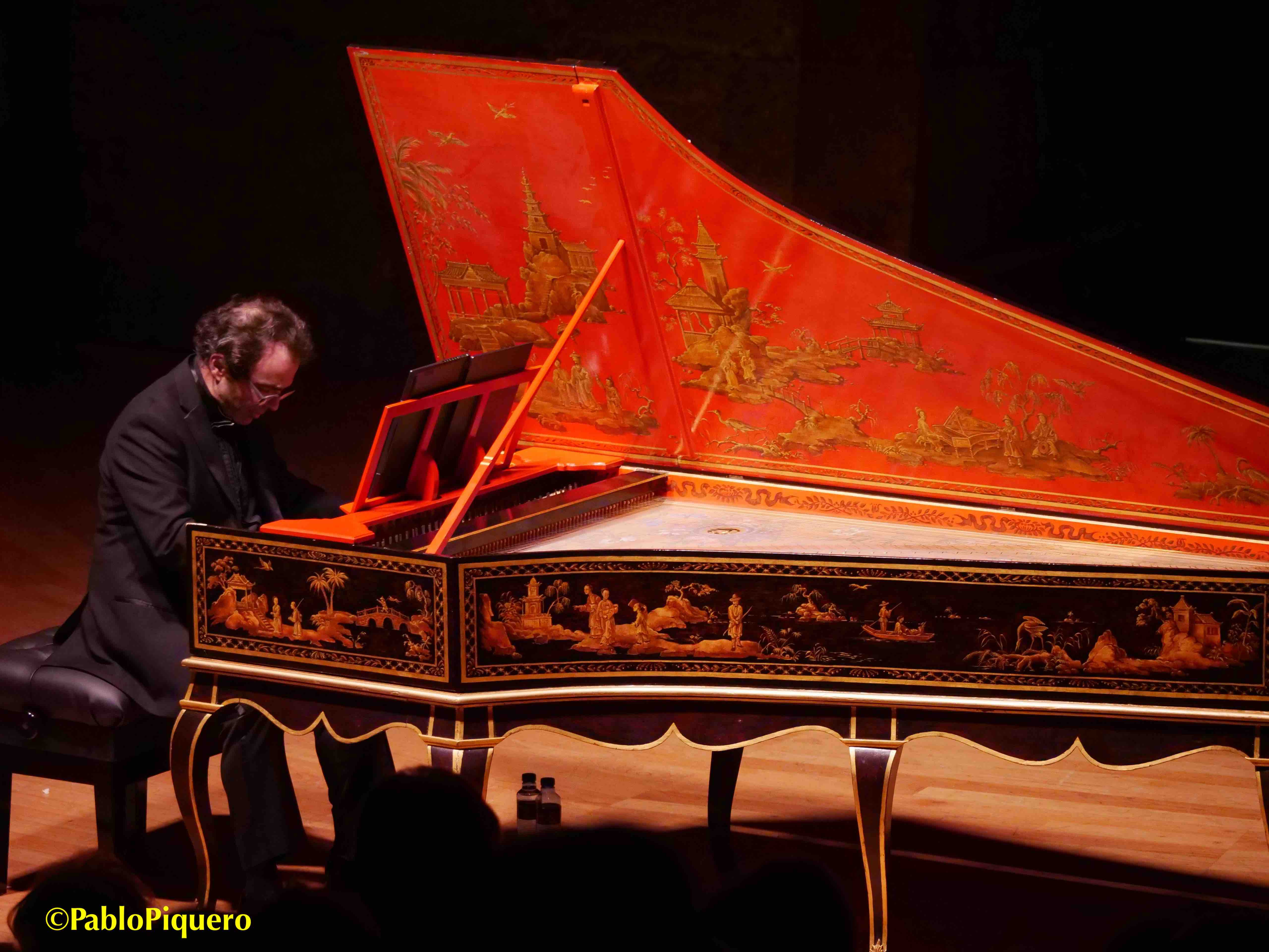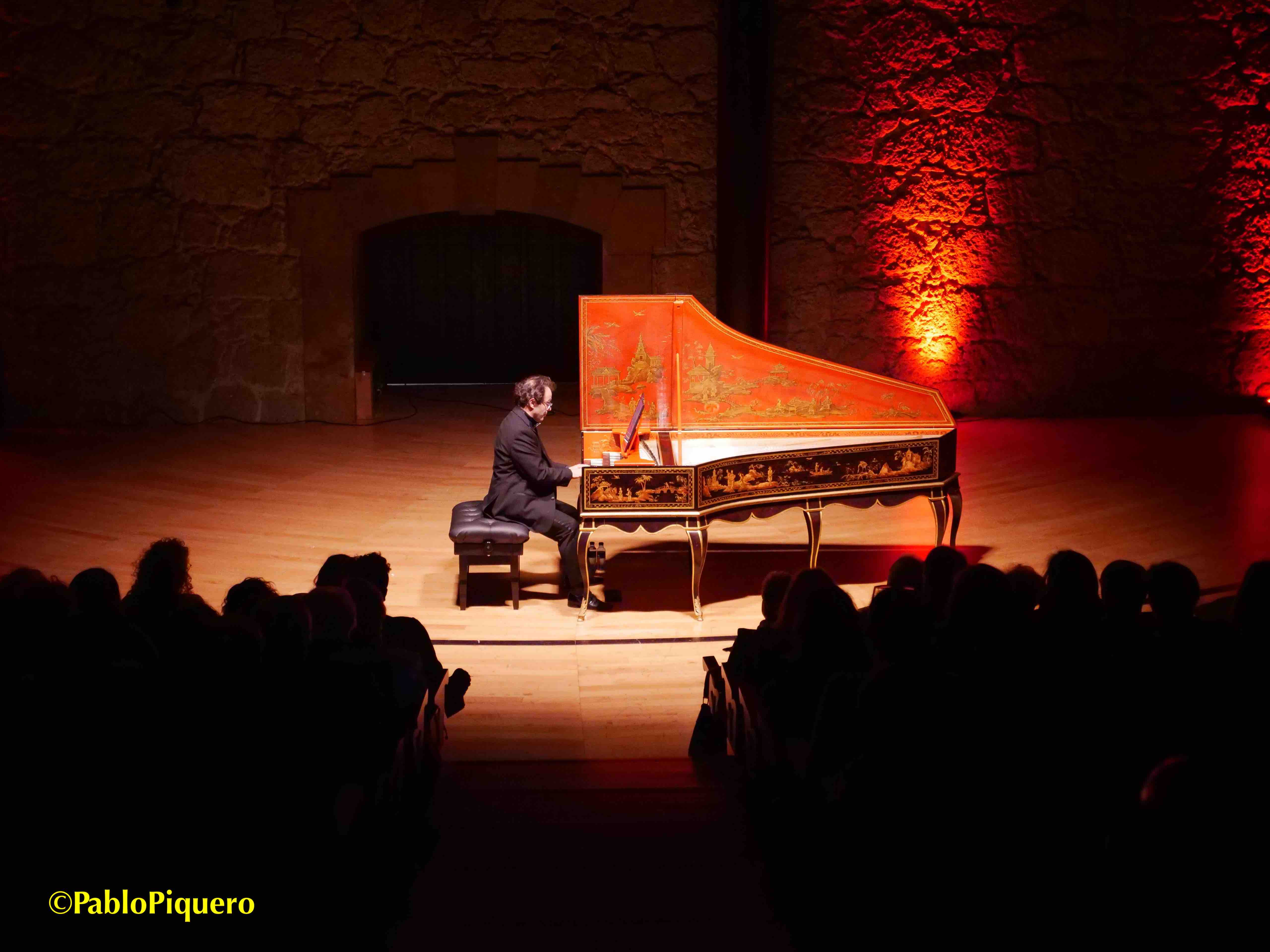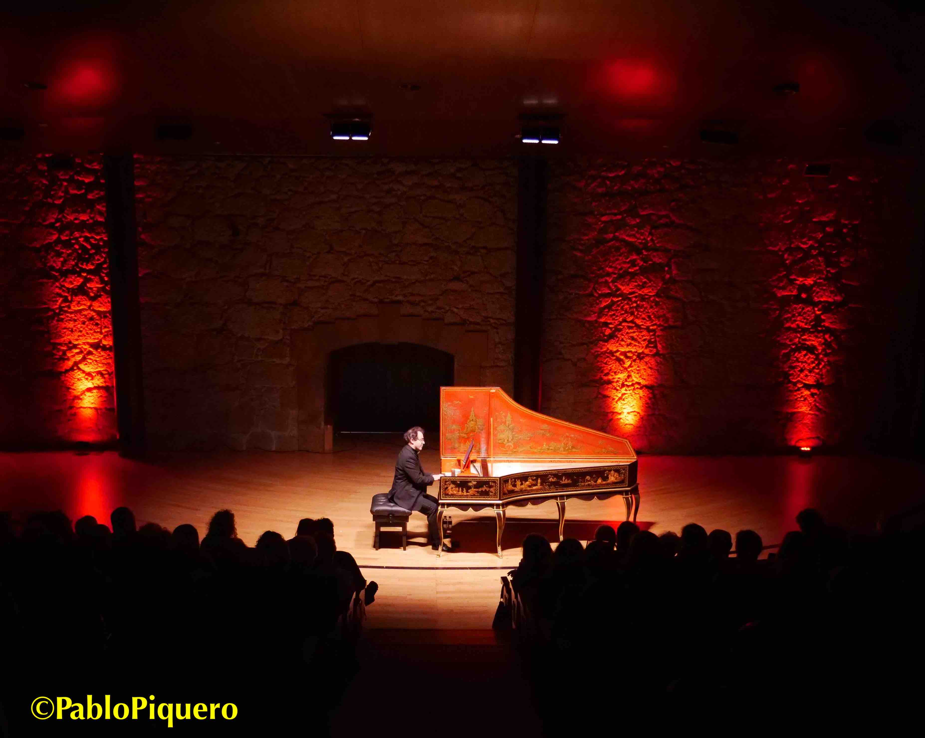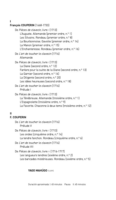 El artículo en femenino hace referencia a «la pieza» de cada Pièces de clavecin y en todas ellas se indican las referencias más o menos directas de cada danza, un mosaico de aires, tempos o registros bien organizados y elegidos por el maestro Mahúgo. Sin entrar a comentar las dos partes (de unos treinta minutos cada una), intercalando «capítulos» del manual con piezas de los libros I y II, que dejo al final de esta entrada, destacar cómo «canta» cada parte melódica, buscando el teclado idóneo al carácter, con una mano izquierda limpia y la derecha siempre elegante, llena de filigranas tan francesas en aquella corte donde todo era refinamiento y libertad (como en los ritmos), unas armonías audaces y sobre todo la enorme expresividad, ornamentos jugosos y una visión madrileña de aire francés bien narrada desde el clave, dejando flotando en el aire los finales que la acústica de la sala de cámara siempre favorece.