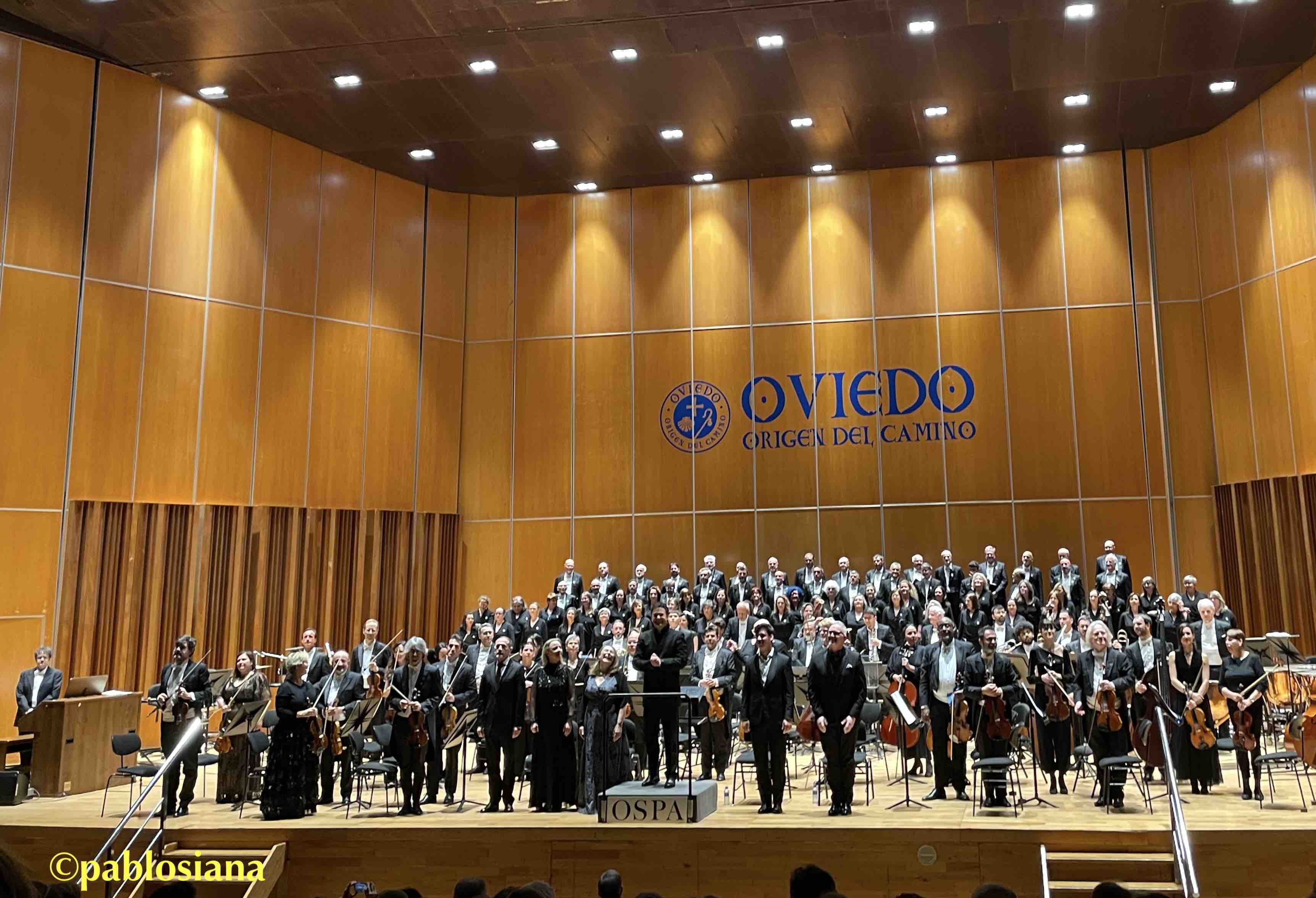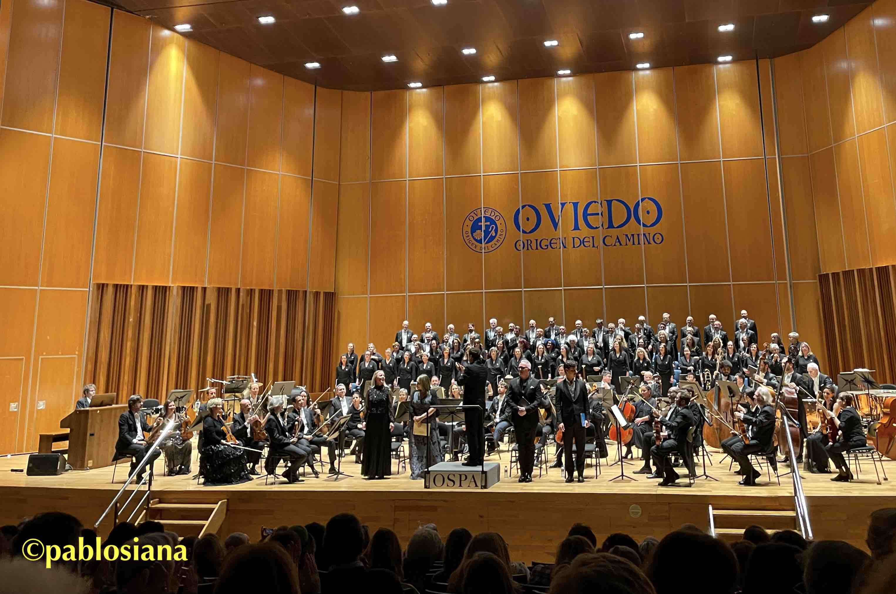 Centrándome en la orquesta asturiana, con una plantilla «engordada» e inmensa para esta misa clásica, la cuerda (hoy de nuevo comandada por Pablo Suárez como concertino invitado) sonó aterciopelada en su momento, intensa y clara en los allegri, el inicio del «Osanna in excelsis» en el Benedictus, llevando a soprano y coro en volandas, maderas devolviéndonos los primeros atriles habituales, metales «orgánicos» por tímbrica y presencia, más los timbales clásicos de cobre, pero una lástima el órgano eléctrico que no se escuchó en ningún momento (tampoco en Elgar). Si como nos avanzaba el director británico que buscaba el estilo, pese a esta versión tan habitual en mis jóvenes años 80, al menos con estos mimbres se tejió una interpretación notable donde la sonoridad pletórica primó sobre una que hubiésemos preferido con la mitad de efectivos, más cercana tanto al Clasicismo como al espíritu de esta «Misa Nelson«.