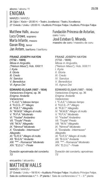 Viernes 27 de marzo, 20:00 horas. Auditorio de Oviedo, OSPA abono 11 «Enigma»: Lidya Teuscher (soprano), Marta Infante (mezzo), Gavan Ring (tenor), Jan Antem (barítono), Coro de la Fundación Princesa de Asturias (José Esteban G. Miranda, maestro de coro), Matthew Halls (director). Obras de Haydn y Elgar.