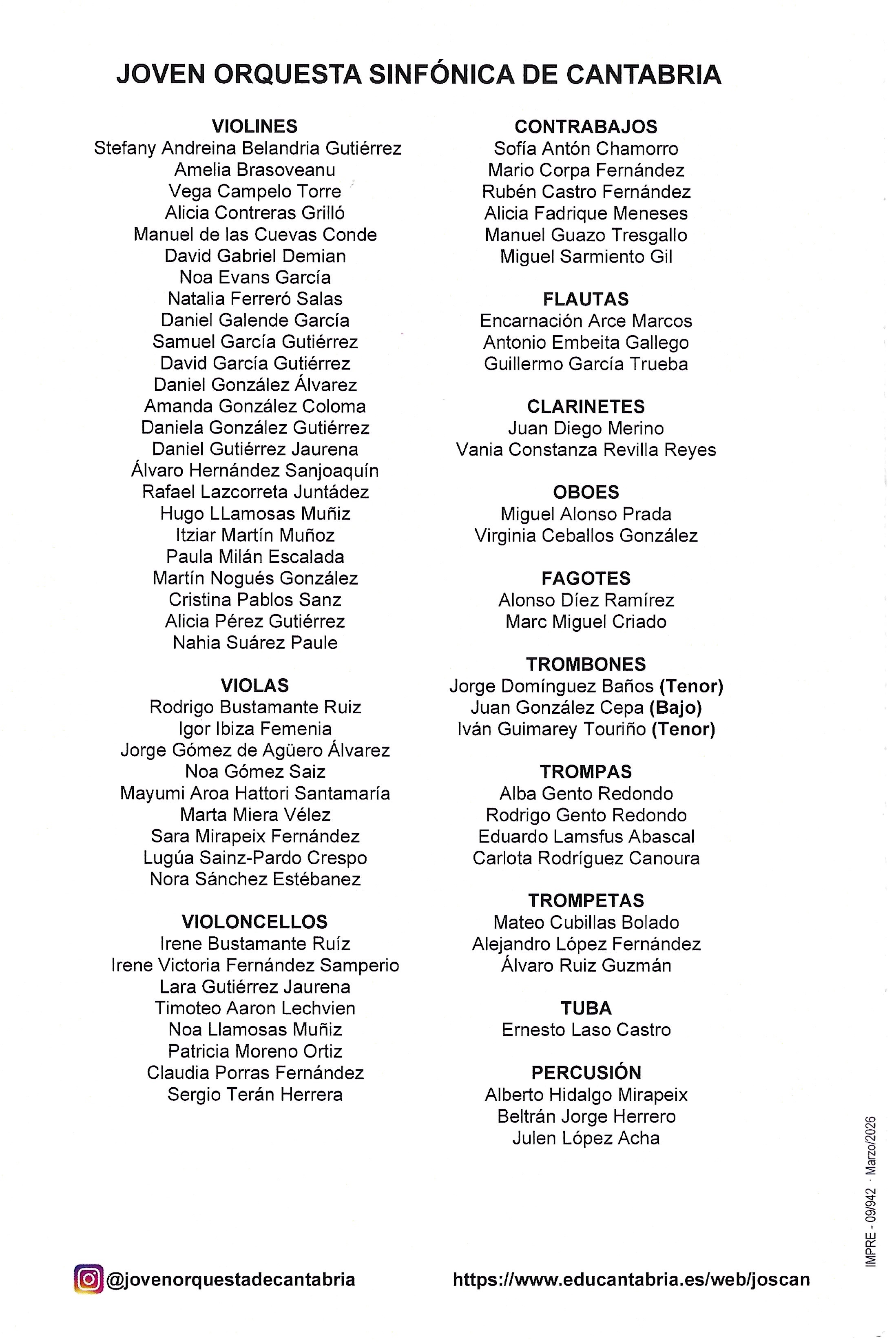 En su presentación figura que la Joven Orquesta Sinfónica de Cantabria (JOSCAN) es un proyecto pedagógico de marcado carácter artístico, cuyo objetivo es contribuir, de forma muy significativa, a la educación musical y preparación profesional de los jóvenes músicos cántabros y de toda la sociedad a través de sus actividades artísticas. Como proyecto educativo, se pretende tender puentes entre las enseñanzas musicales de los conservatorios de esa comunidad, las enseñanzas musicales superiores y el entorno profesional de la orquesta. Desde sus comienzos en 2011, bajo la dirección artística de Emilio Otero, la JOSCAN ha contado en sus diferentes etapas con prestigiosos directores: el cántabro Jaime Martín, junto a maestros como José Luís Temes, Enrique García Asensio, Vladimir Stoupel, Andrés Juncos, la murciana Virginia Martínez o el mexicano Iván López Reynoso. Desde entonces han dado 10 conciertos, siendo estos del «Encuentro de Primavera 2026» el sexto de esta temporada tras un paréntesis de cinco años felizmente recuperado y necesario en el actual panorama sinfónico nacional. Se plantaron semillas en todos los terrenos que dependiendo del interés, buen abono, barbechos, y tiempo, han germinado e incluso creciendo como es el caso. Se podría escribir mucho de tantos excesos que marchitaron los buenos frutos, la escasa inversión o una mala «comercialización» de un producto que incluso hemos exportado a medio Europa, más allá del viento. Así que solo queda aplaudir esfuerzos como este de Cantabria, pleno además de cantidad y calidad musical, que no solo son cantera para el futuro sino una realidad digna de comentar.