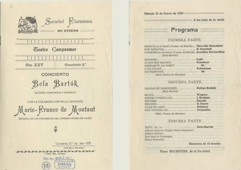 El siempre recordado Adolfo Casaprima Collera (1961-2024) en el libro “Una vida para la música: Historia de la Sociedad Filarmónica de Oviedo, 1907-1994”, dedica un apartado titulado ‘Bartók y su poético ayudante’ (pág. 110 y ss.) donde refiere que «La epidemia de gripe que invade España preocupa sobremanera a los directivos de la Sociedad Filarmónica al inicial la temporada de 1931. Han recibido un telegrama en el que se les anuncia que el compositor Béla Bartok, que debe actuar en el Campoamor el día 31 de enero, se ha contagiado con la enfermedad. Afortunadamente, se recupera rápido y el músico húngaro tan solo retrasa su comparecencia al 3 de febrero, desestimando anular sus citar españolas, como le propone su representante». Llegaba en la cúspide de su carrera y las notas al programa de mano las escribió Adolfo Salazar, con un lleno en el coliseo carbayón de público venido de todas partes, y entre el que estaba Gerardo Diego, apasionado por la música y gran aficionado al piano, acompañado por el pintor gijonés Nicanor Piñole, siendo de destacar que el poeta se llegó a cartear con el húngaro de quien aseguró que “con Ravel, Falla y Stravinsky, forman cuatro puntos cardinales de la música moderna (…) Bartók es el Norte, el punto donde convergen las dos tendencias opuestas”. A Oviedo Bartók llegaría como pianista además de acompañar a la cantante Marie-France de Montaut, solista de los conciertos del Conservatorio de París.