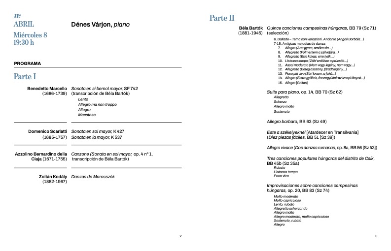 Como entonces, en este abril de 2026 el concierto comenzaba con transcripciones que el propio Bartók realizó de las sonatas en si bemol mayor de Benedetto Marcello (1686-1739), y la Canzone de la opus 4 nº 1 de Azzolino Bernardino della Ciaja (1671-1755), «obras para piano típicamente románticas que recuerdan a las transcripciones de Bach realizadas por Ferruccio Busoni (y otros contemporáneos), con una mayor densidad de la textura musical (octavas dobladas, acordes con más notas)» con las partituras en el atril que Várjon ejecutó con una técnica impecable, de ataques precisos, un pedal muy medido para saborear el enfoque virtuosístico que estas dos sonatas esconden aunque no con la profundidad de las dos siguientes de Domenico Scarlatti (1685-1757) ejecutadas sin pausas: la K 427 en sol mayor, y la K 537 en la tonalidad de la mayor. Impecable su técnica y sonoridad amplia, el acercamiento que hoy en día están haciendo muchos pianistas al repertorio de clave con la grandiosidad de las 88 teclas y una digitación cristalina emulando la cuerda pinzada, pero con la tímbrica poderosa del piano. Bartók conocía la edición completa de Scarlatti preparada por Alessandro Longo en 1906 y hasta dejó grabadas las cuatro, con estas dos elegidas por Várjon.