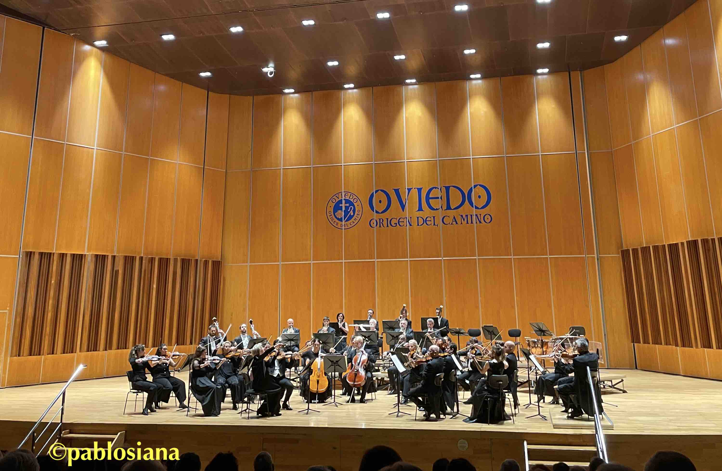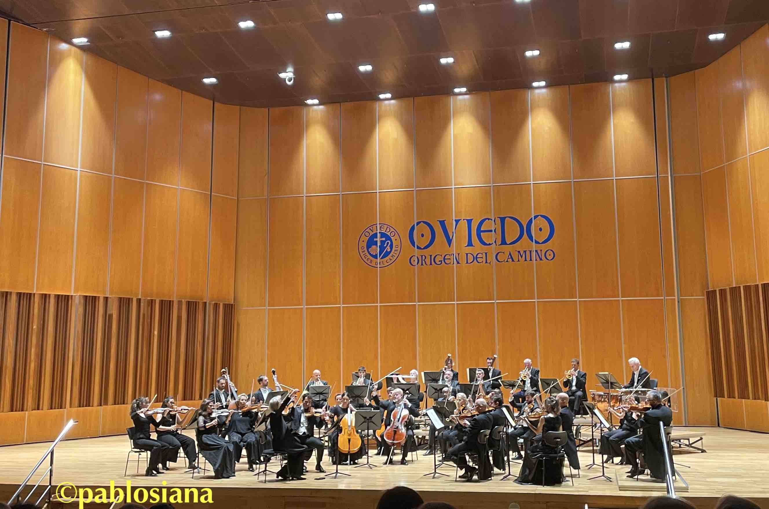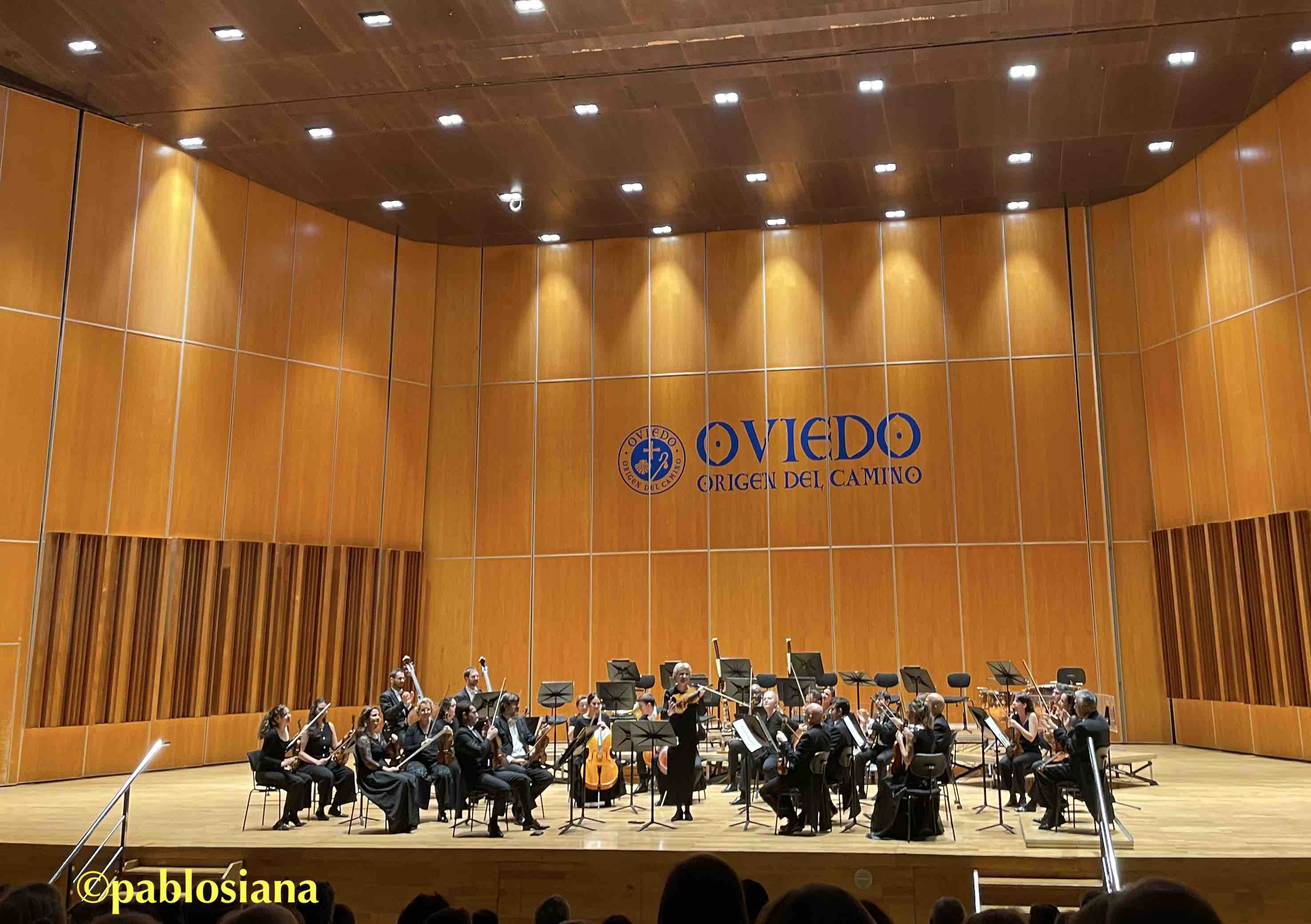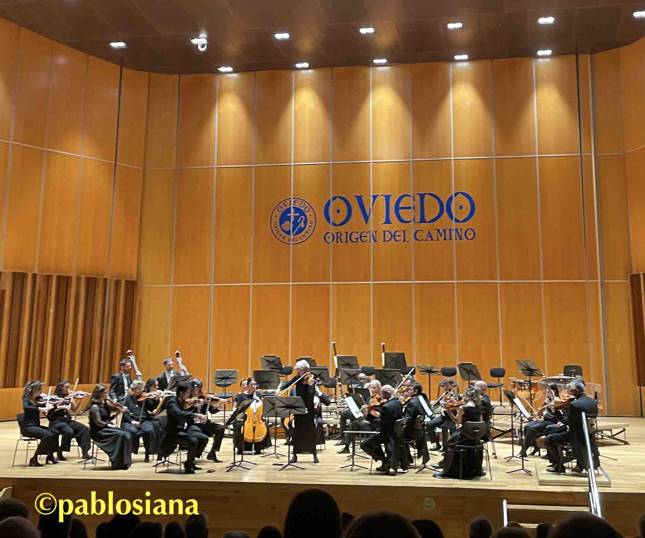 «La Sinfonía en do menor Hob. I:95, compuesta por Haydn en su primer viaje a Londres (1791-92), es la única de las londinenses en tonalidad menor y sin introducción lenta». La profesora Weithaas con Daniel Jaime de ayudante, nos enseñó cómo se «lleva» a la OSPA desde el puesto de concertino. «El primer movimiento contrapone unísonos apasionados y pasajes más íntimos», y esos unísonos fueron perfectamente ejecutados así como los matices, sin necesidad de marcarlos porque la propia música invitaba a escucharse por parte de toda la orquesta. «El Andante cantabile presenta un tema lírico con tres variaciones, la segunda marcada por contrastes dinámicos y modulaciones» de nuevo obligaba a la formación a un entendimiento y colaboración para que las muchas y variadas dinámicas de este segundo movimiento se ejecutasen, escuchándose todos, y se logró con un sentido y sonido unitario al más ajustado Sturm und Drang, como «el padre de la sinfonía» dejó para las generaciones posteriores. «El Minueto alterna secciones contrastantes de un carácter más tenso, y el Trío, en do mayor, permite lucirse al violonchelista principal». La cuerda asturiana sigue manteniendo un color propio, yo lo llamo «cantábrico»,y cercano a las formaciones británicas, algo que se alcanza tras más de tres décadas de «hacer música» juntos. Contar con Maximilian von Pfeil es un lujo como pudimos comprobar en el segundo movimiento y especialmente en este Menuet que me recordó al Haydn de su concierto para chelo. «El Finale, con brillante contrapunto, cierra enérgicamente la sinfonía, regresando a la tonalidad menor inicial» y literalmente resultó brillante y enérgico con todas las secciones perfectamente empastadas, los balances adecuados y una atención total a la Maestra Weithaas.