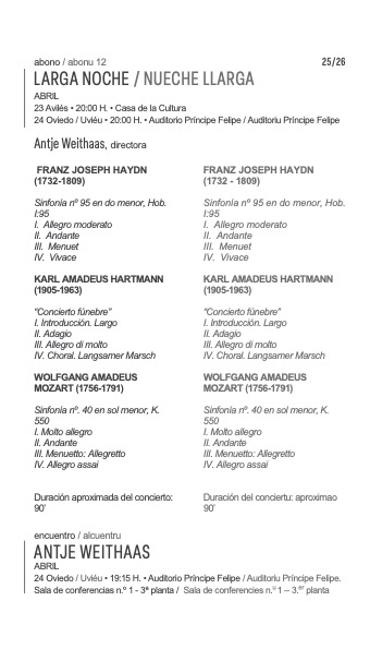 Concierto duodécimo de abono de una OSPA casi camerística en «disposición vienesa» que nos traía a la violinista y directora alemana Antje Weithaas (Guben, 1966) con un programa que «pone las pilas» a toda orquesta, y más cuando se dirige como concertino en el caso de las sinfonías clásicas, lo que exige responsabilidad a toda la orquesta, compartir y escucharse, pues las dinámicas escritas no siempre ayudan a un balance adecuado, más el concierto solista donde la violinista logró «concertar», poner de acuerdo y alcanzar un nivel altísimo.