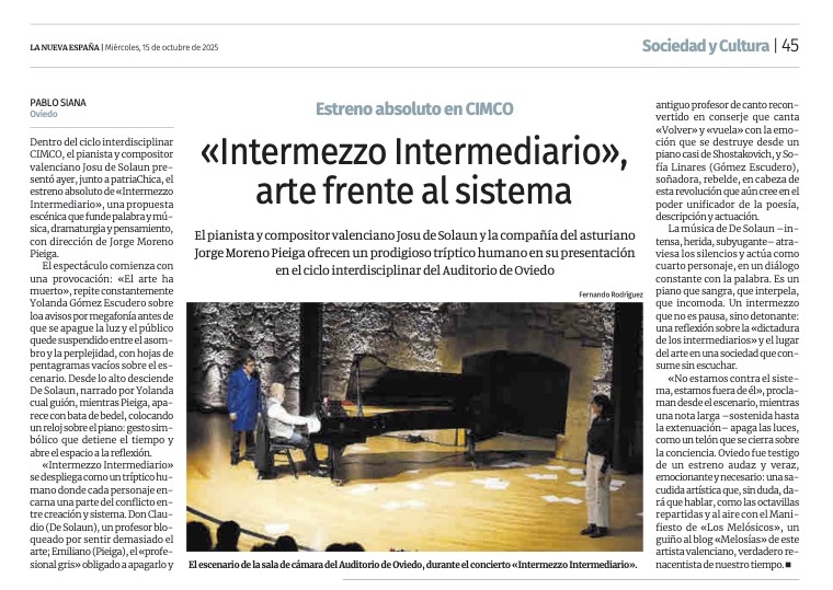 Sensaciones, emociones y una orquesta siempre dúctil, versátil, madura tras años de trabajo y capaz de afrontar tanto el barroco en el foso como estas obras de nuestro tiempo con un Macías que sabe cómo sacar lo mejor de todos ellos, con la percusión alcanzando a pintar los claroscuros de este cuadro sinfónico. El compositor, presente en la sala, además de saludar al respetable felicitaría una interpretación que a buen seguro le satisfizo. Mi valoración no puedo separarla del estado de ánimo que me dejó un nudo en la garganta.