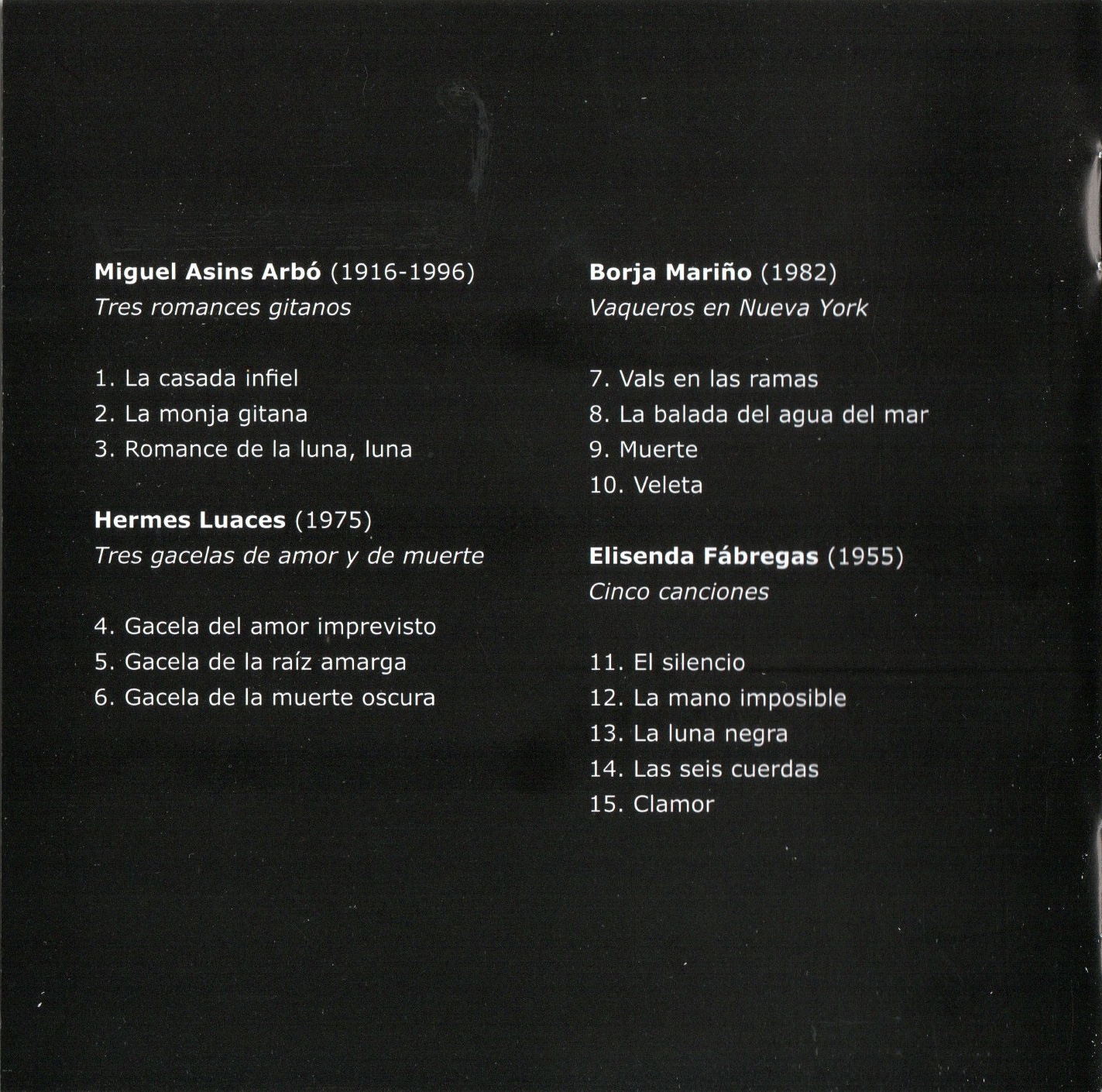 El disco lo cierran las Cinco canciones de la egarense (y estadounidense) Elisenda Fábregas: El silencio, Las seis cuerdas y Clamor («Poema del cante jondo», 1931), De la mano imposible («El diván del Tamarit», Casida VI) más La luna negra (poesía varia). Meditación silenciosa y por momentos etérea, sugerente en el piano, sentida en la voz («un silencio ondulado»), con saltos interválicos precisos y acordes apoyando la armonía. No una sino las dos manos de Aurelio presentando el siguiente poema lleno de misterio y simbolismo en la voz de Naroa, otra visión de la muerte que atormentaba y presagiaba nuestro poeta más universal, finalizando con «la sábana blanca de mi agonía» rubricado por el piano solista siempre coprotagonista. De la luna lorquiana a la que pocos compositores e intérpretes han podido sustraerse, estaba claro que Don Aurelio es cual hombre lobo que sabe elegir y sacar el máximo partido a esta composición dual, misteriosa y mágica, contagiada a una Naroa subyugada en una línea de canto sugerente. Y otro referente de Lorca, admirador de Sainz de la Maza, las guitarra que «hace llorar a los sueños», cada palabra vibrante como cada cuerda en los ocho versos, registros extremos en el instrumento con forma de mujer y recia madera en la interpretación de los dos artistas, antes del Clamor final, doblar de campanas repicando en un piano catedralicio, el dramatismo vocal de plegaria y llanto, oscuridad de liturgia musical fielmente reflejada para el propio sentir de los versos de Lorca.