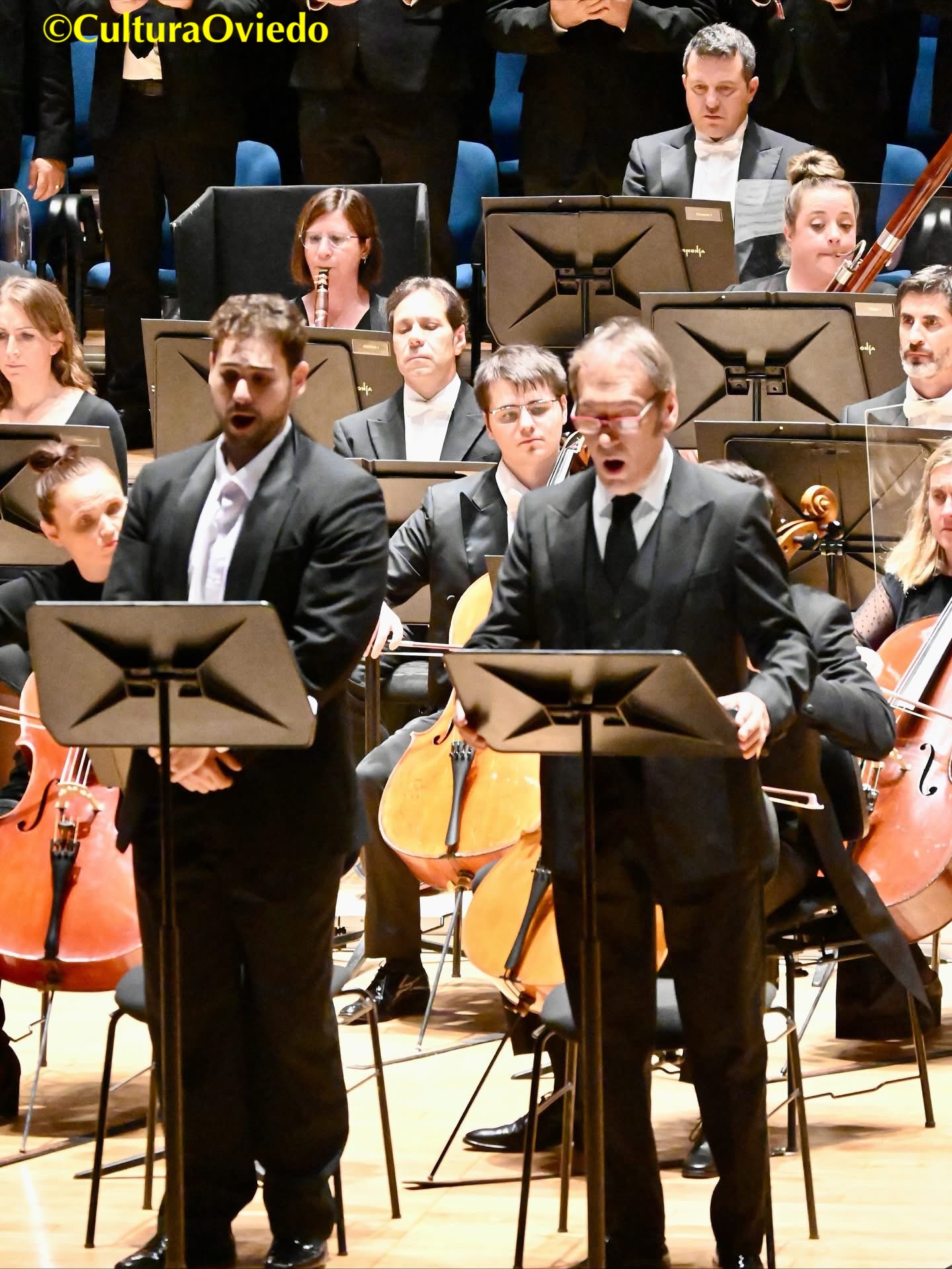 El inicio resultó correcto, matizado, con un coro suficiente de volumen en todos los planos y un cuarteto solista empastado, presente pero no del todo equilibrado, primer toque de atención para este número inicial cuando el tenor hispano-argentino atacaba los agudos con unos portamentos nada correctos pero al menos bien contrastados por «48 leones» (12 por cuerda con las voces blancas flanqueando las graves, y éstas permutadas, buscando una sonoridad acorde con la sinfónica), siempre seguros y atentos sin necesidad de «apianar» la orquesta. Las solistas emergieron sobre la masa instrumental en unos agudos limpios.