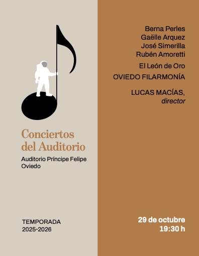Miércoles 29 de octubre, 19:30 horas. Auditorio Príncipe Felipe, Oviedo. Inauguración del ciclo «Los Conciertos del Auditorio«: Berna Perles (soprano), Gaëlle Arquez (mezzo), José Simerilla (tenor), Rubén Amoretti (bajo), El León de Oro (maestro de coro: Marco Antonio García de Paz), Oviedo Filarmonía, Lucas Macías Navarro (director). Obras de R. Carnicer y G. Rossini.