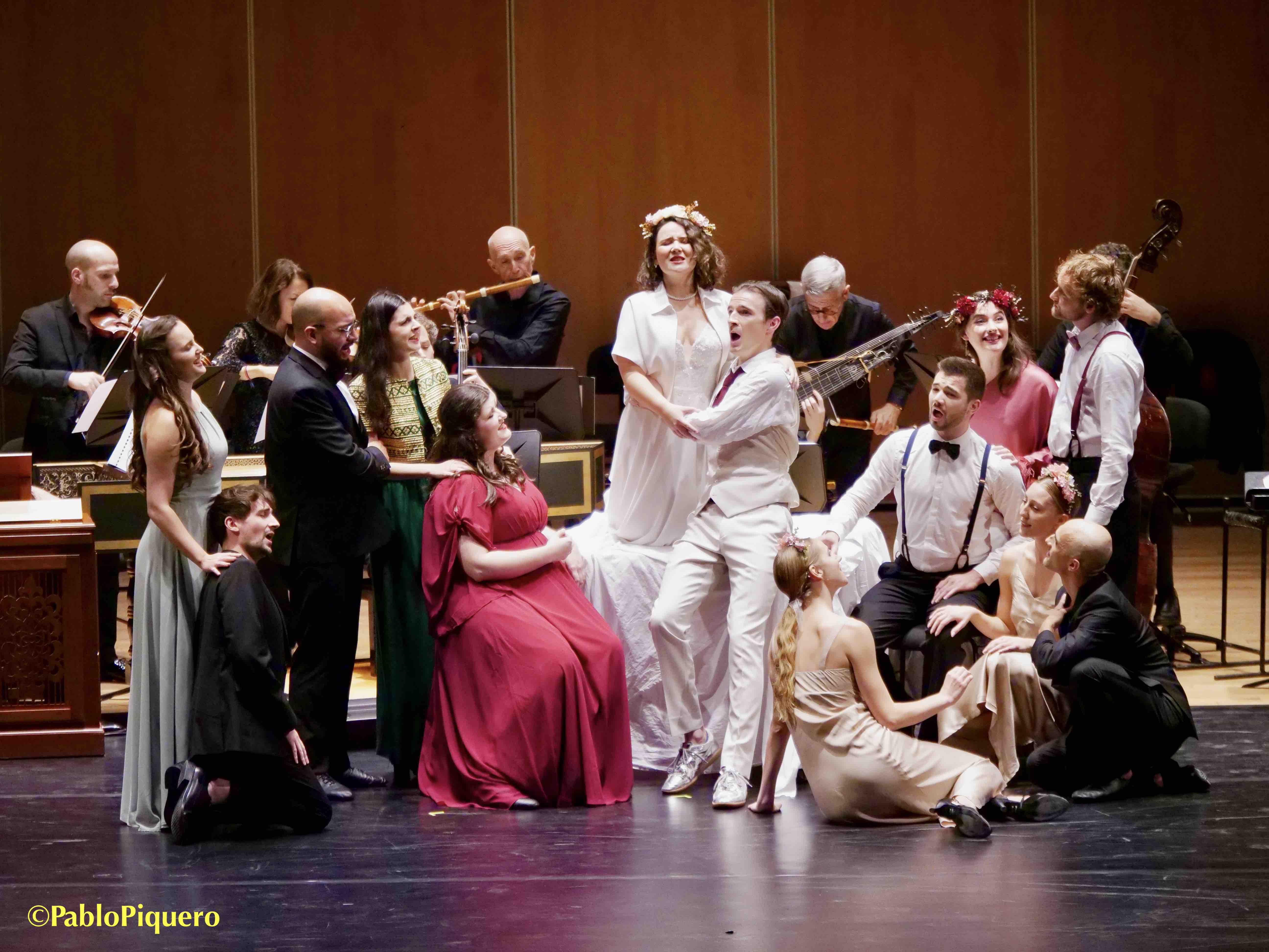 Prólogo y cinco escenas donde las cuatro artes (Música, Pintura, Poesía y Arquitectura) fueron interpretadas y dramatizadas, en toda la extensión de la palabra, por la soprano francesa Camille Chopin, el tenor galo Bastien Rimondi, la estadounidense Sarah Fleiss también soprano, y no una mezzo sino la contralto canadiense-estadounidense, Sydney Frodsham, cuatro colores vocales bien diferenciados para cada uno de los personajes, de volúmenes suficientes que por su juventud perderían algo en los registros graves pero con proyección suficiente.