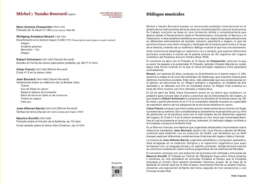 Marc-Antoine Charpentier (1643-1704): Preludio, de Te Deum H. 146 (a tres manos. 1688-98); Wolfgang Amadeus Mozart (1756-1791): Divertimento en si bemol mayor, K 240 (1776. Transcripción para órgano a cuatro manos); Robert Schumann (1810-1856): Estudio en forma de canon para piano-pédelier, op. 56, nº 4 (1845); César Franck (1822-1890): Coral nº 3 en la menor (1890); Jean Bouvard (1905-1996): Variaciones sobre un villancico de La Bresse (1969); Juan-Alfonso García (1935-2015): Veritas de terra orta est (de Cuatro piezas para órgano. 1959); Maurice Duruflé (1902-1986): Preludio sobre el Introito de la Epifanía, op. 13 (1960); Coral variado sobre «Veni Creator», op. 4 (1931).