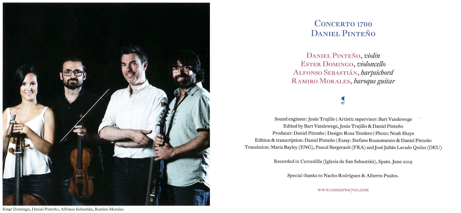 Concerto 1700 está conformado para esta grabación por DANIEL PINTEÑO al violín, ESTER DOMINGO en el violoncello) y ALFONSO SEBASTIÁN desde el clave, trabajo muy conseguido por todos ellos en una plantilla ideal para estas sonatas, violín y bajo continuo habitual en la época, añadiendo la guitarra barroca de RAMIRO MORALES en Nardini al ser uno de los instrumentos que no solo aportan sonoridad mediterránea sino el instrumento favorito de aquella España del dieciocho aún con cinco órdenes además de habitual acompañante de voz y violín.