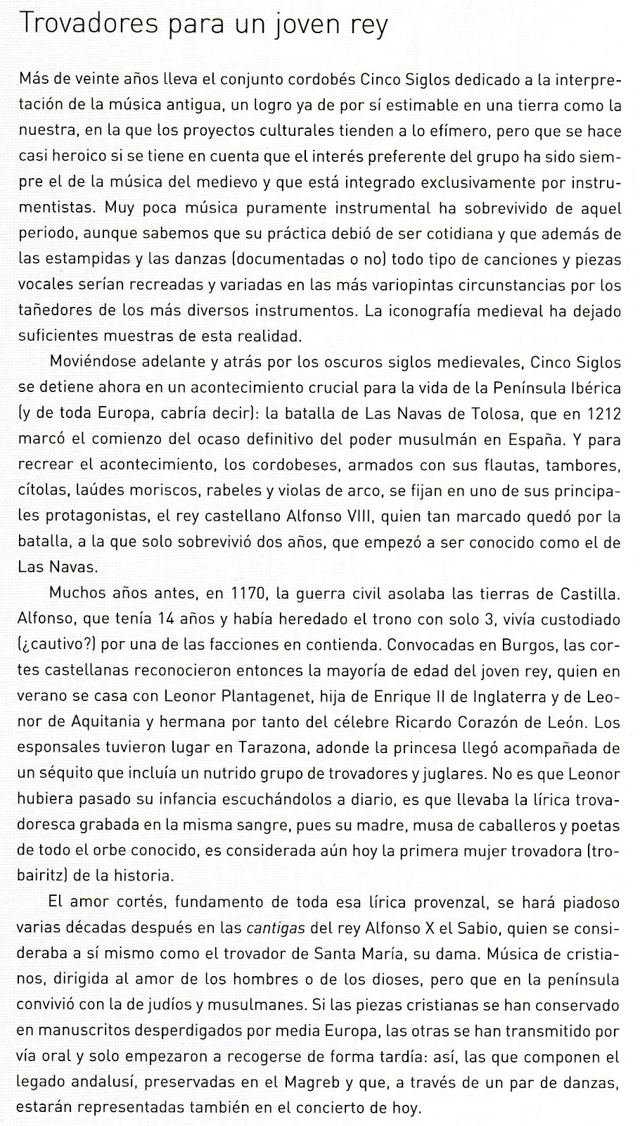 El programa incluía también una moaxaja andalusí, como muestra de la música vocal del momento y del rico patrimonio peninsular, añadiendo una pieza de devoción mariana perteneciente al Llibre Vermell, una «cantiga de escarnio y maldecir» firmada por Alfonso X «El Sabio» y una canción del trovador del Rosignol Berenguer de Palou.