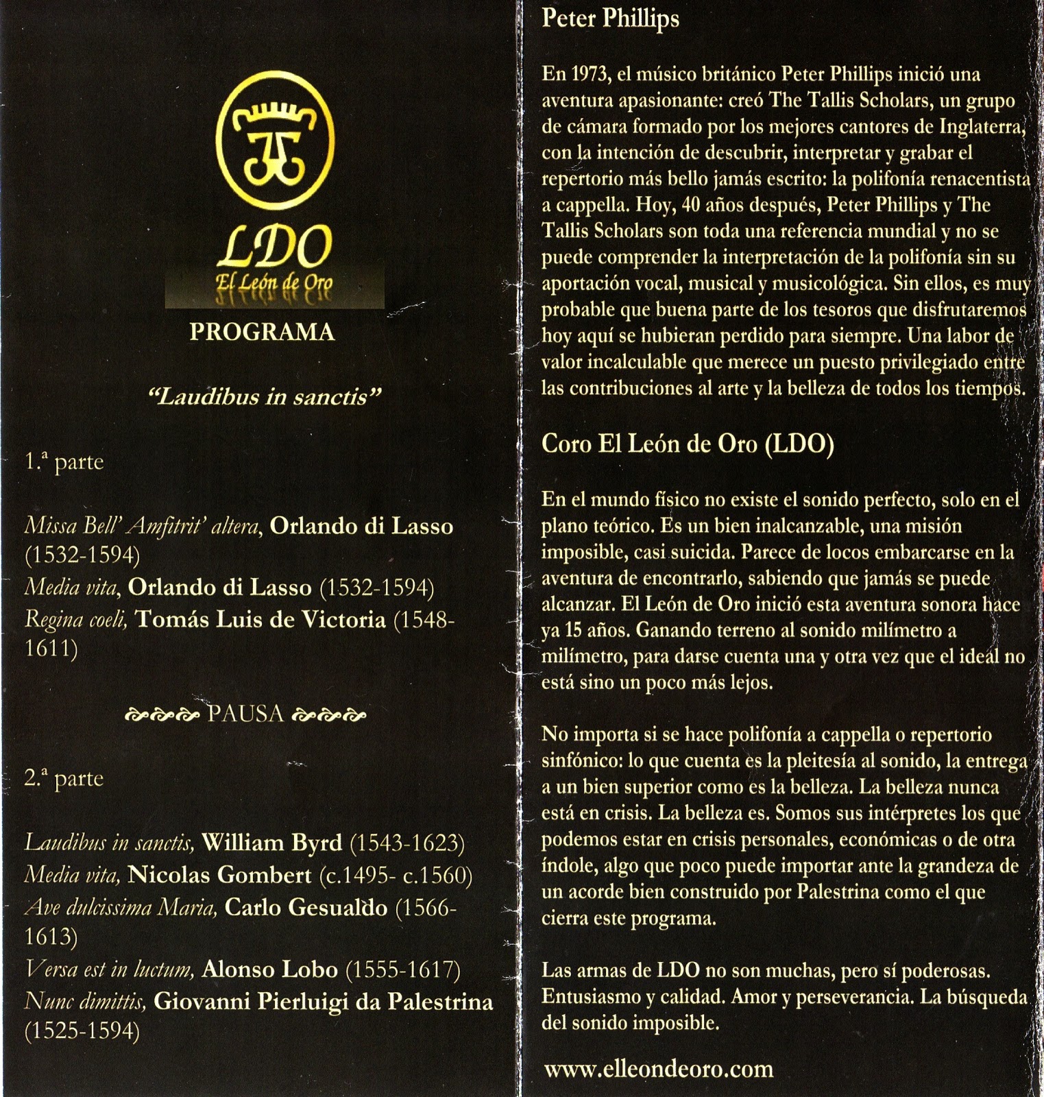 De la trilogía o «tridente dorado», nada mejor que escuchar a Francisco GUERRERO (1528-1599), primero con las voces blancas en el Sancta et immaculata (1589) que aprovechan la «Cantera Aurum» en este canto a la Virgen para tres voces de sopranos y una de alto, ideales por su tesitura brillante para esas dos cuerdas femeninas que mantienen un color y volumen dignos de admiración; proseguirían con la villanesca Mi ofensa es grande (1589), la única que no se cantó en latín pero igualmente de dicción clara en su polifonía; el Ave Virgo sanctissima (1566) a cinco voces (con dos de tiple) sería otro nuevo despliegue vocal, especialmente en los registros extremos (sopranos y bajos), más el motete funerario a seis voces Hei mihi, Domine (1582) que se escuchó en las exequias por Felipe II celebradas en la catedral hispalense en 1598, tal y como nos cuenta en las notas al programa Pablo J. Vayón. Buena elección y colocación de las distintas obras y formas utilizadas (antífona mariana, villanesca, motete) por el maestro de capilla sevillano avanzando ya una policolaridad que el LDO interpreta como pocos dada la versatilidad de sus componentes.