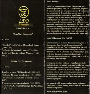 Y aprovechando el reciente cuarto centenario del fallecimiento del compositor abulense Sebastián de VIVANCO (ca. 1551-1622), Los Leones nos ofrecieron lo mejor de su repertorio «a capella» donde escuchar parte de la «terna» (sólo faltó Morales) con un Victoria impresionante (el más aplaudido incluso antes de finalizar las obras) junto a un Lobo de altura, o al menos conocido Tejeda, e incluso recuperar obras que suponen un estreno en nuestros tiempos.