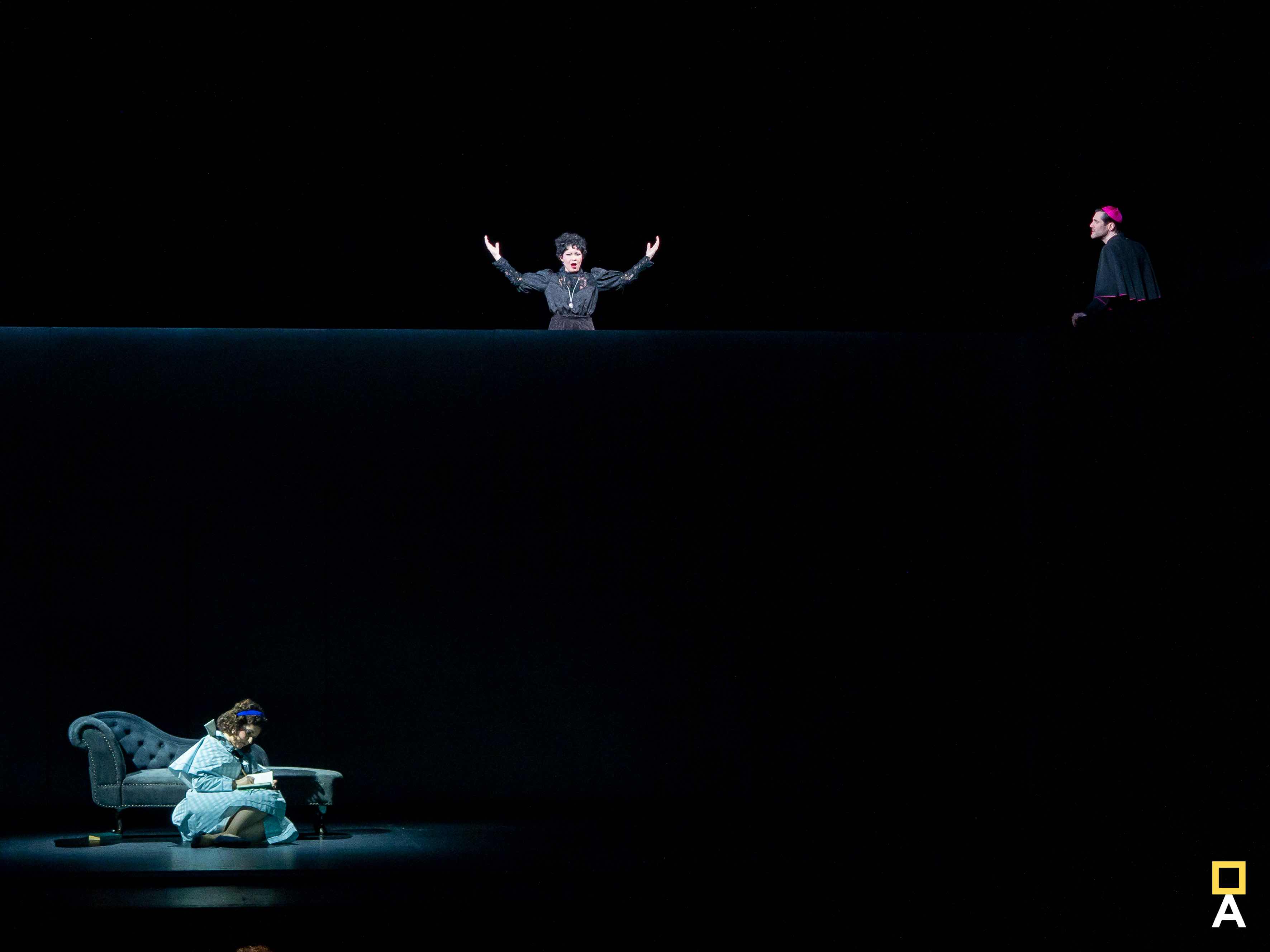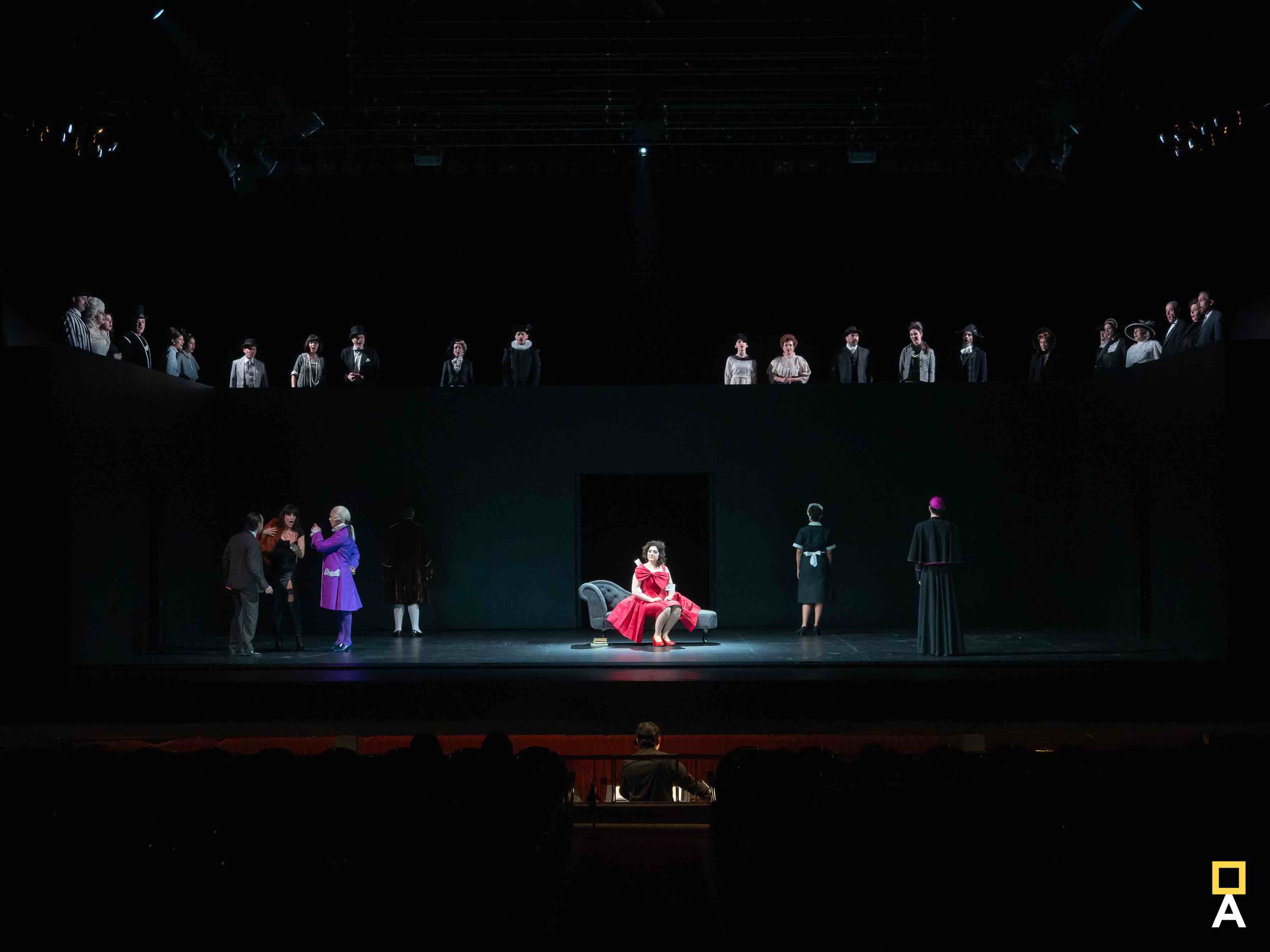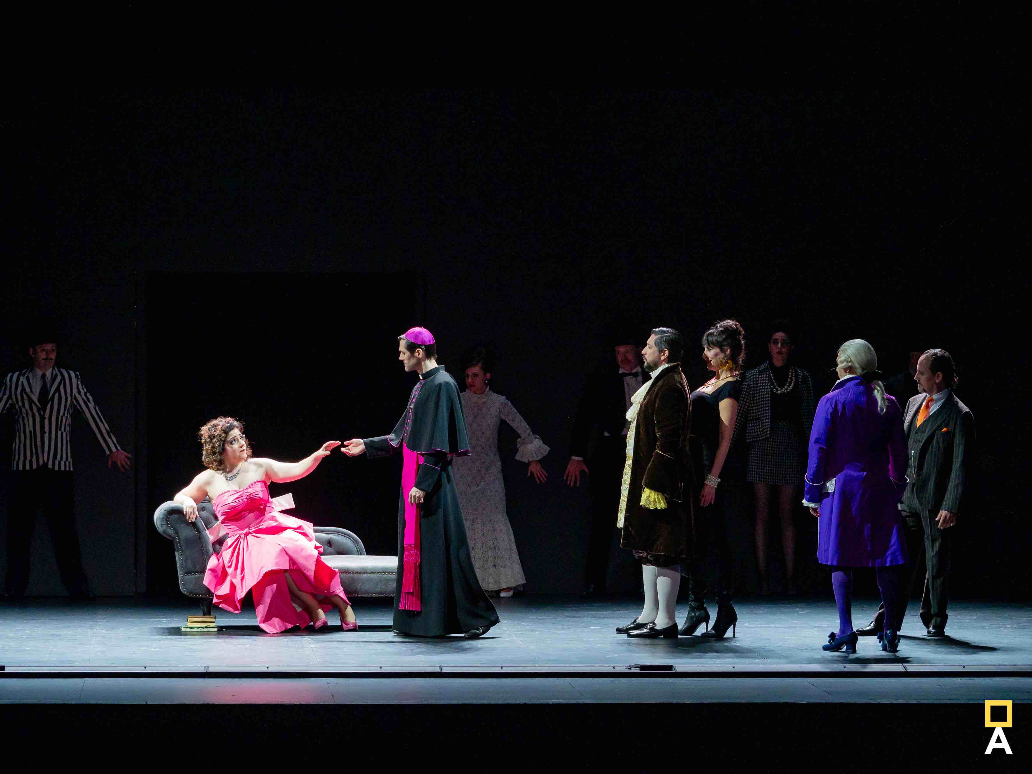 No me gustó nada el vestuario de Gabriela Salaverri que pese a los distintos colores, muy terrosos, mezcla pelucas dieciochescas con trajes de diseño (?), o una orgía sin mujeres, claro que escribe Susana que no hay lugar para ellas, pues “están escondidas (…) en un mundo de hombres y en el que solo los hombres tienen un lugar. Las mujeres habitan en los márgenes (…)”, travistiendo cual Drag-Queens al personal masculino (el Coro Intermezzo siempre seguro y matizado además de coreografiado por Olimpia Oyonarte) en un entorno de brillos muy sesenteros con redondos sillones amarillos para la fiesta en el salón de baile inicial donde tampoco faltarían los abanicos.