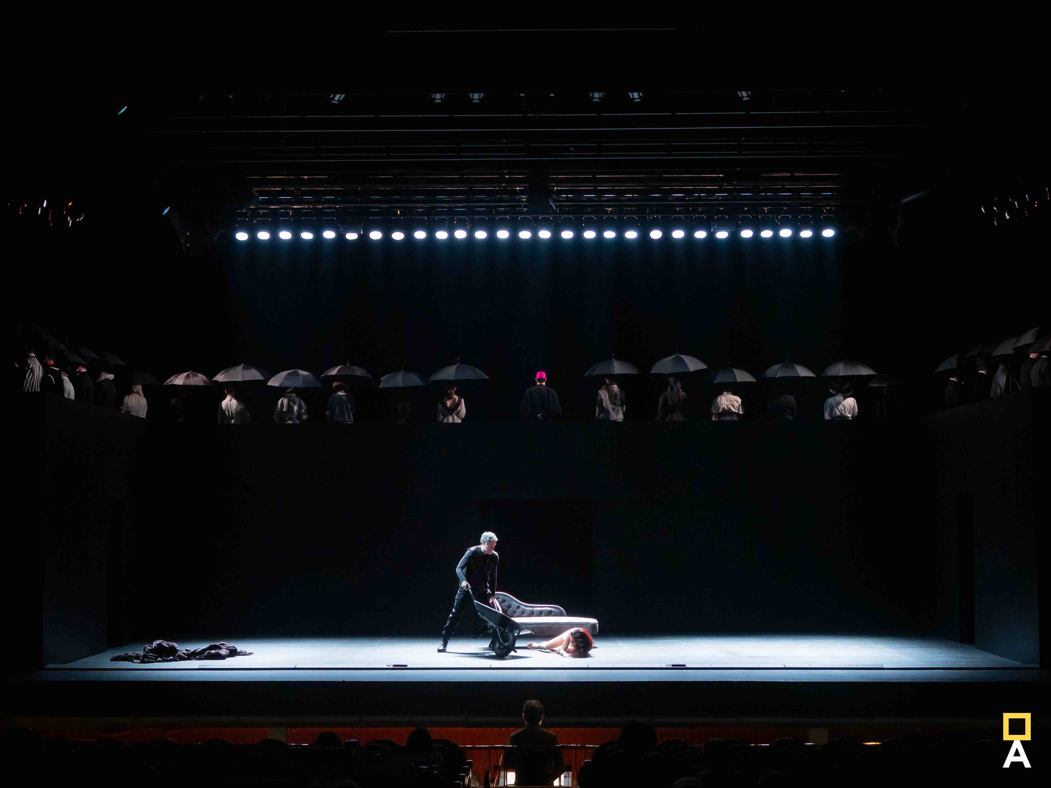 El diseño de Ricardo Sánchez Cuerda con la escena de la ovetense Susana Gómez son un reciclaje, pues no están los presupuestos para dilapidarlos, aunque si se prefiere es un ‘regreso al proyecto iniciado con el «Hamlet» de 2022’, como así lo presenta la asturiana en el libreto de este título, que además titula “Sigue la tormenta” para disipar cualquier duda. Dos facetas (El Duque de Mantua actual y el Príncipe danés de entonces) con “un proyecto conceptual único en el que se muestra la realidad de un hombre que, al querer tomar la justicia por su mano, termina devorado por la máscara que construye para restituir el orden justo”, máscara de la deformidad de la que el protagonista se despoja varias veces sin apenas cojear, y donde el inocente acaba siendo víctima de sus intentos de reparación de los desajustes sociales, por otra parte muy actual siglo y medio después del estreno en La Fenice veneciana.