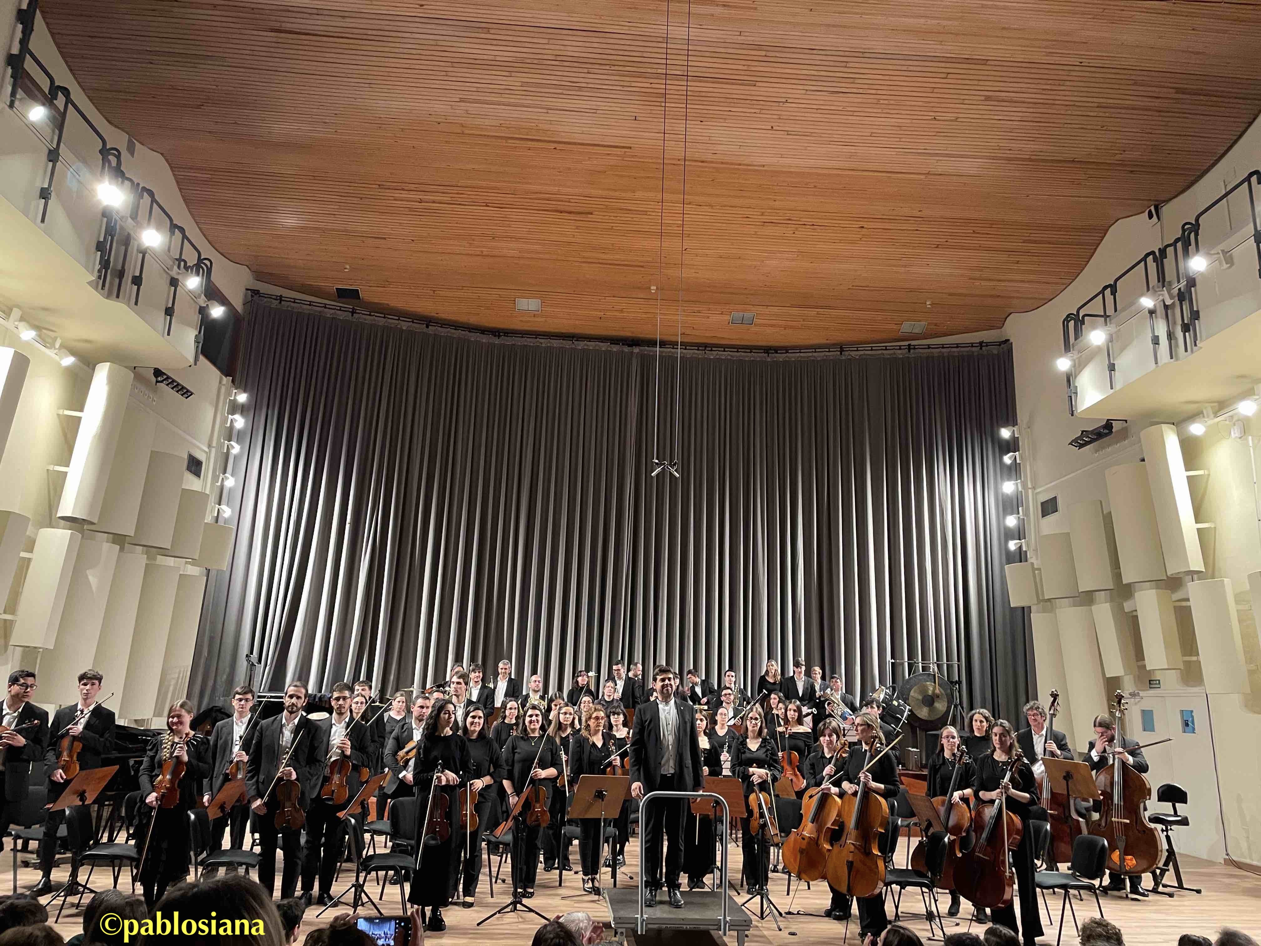 Desde el Adagio-Allegro molto inicial, Ordieres planteó una lectura de amplios arcos formales, con una introducción solemne y bien graduada que desembocó en un allegro de pulso firme. El célebre Largo fue abordado con un tempo contenido y una atmósfera recogida, destacando la calidez y calidad del solo de corno inglés, sostenido por un acompañamiento delicado y expresivo que evitó cualquier exceso sentimental, trabajando los matices y equilibrios entre las secciones. El Scherzo, rítmicamente incisivo, mostró a una orquesta ágil y bien articulada, mientras que el Allegro con fuoco final cerró la obra con energía y coherencia, integrando los motivos recurrentes de la sinfonía en un clímax convincente, siempre  bajo el magisterio de «junior». Personalmente quiero felicitar especialmente a los componentes de “mi” Banda Sinfónica del Ateneo Musical de Mieres por sus respectivos solos a Alba García (flauta) y Mateo Velasco (trompeta) porque estoy viéndolos crecer en todos los sentidos, y su participación en la Orquesta de la Fundación Filarmónica de Oviedo es un escalón más en su formación y toda una experiencia siempre enriquecedora en el largo camino de los músicos.