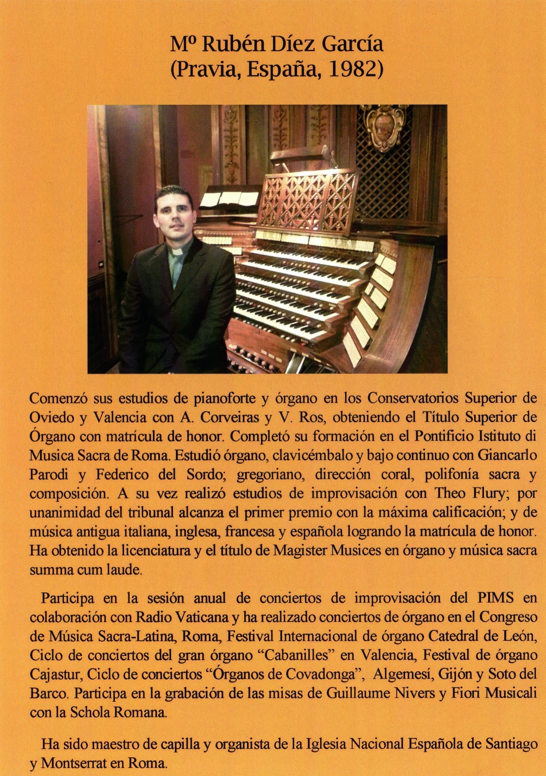 La «Fantasie» de Martin Grabert(1868-1951) sirvió para comenzar a deleitarnos de las capacidades del pedal de expresión unidas a unos contrastes dinámicos desde los propios registros realmente exigentes, con unos oboes muy del gusto del compositor. La «Misa para órgano para la festividad de Cristo Rey» de Luis José Urteaga Iturrioz (1882-1960) resultó una agradable sorpresa en sus seis números, de estética cercana a la escuela francesa y digna de compartir concierto con el resto de compositores y organistas, intérprete y compositor de amplia producción donde también tuvo su hueco el harmonio cual hermano menor del grandioso de tubos. Triunfante Entrada (Exibunt aquae vivae de Jerusalem), lirismo contenido en el Ofertorio (Vexilla Christus inclyta), tintes impresionistas de recogimiento para la Elevación (Ecce vir Oriens), desarrollo tímbrico y melódico en la Comunión (Dominus judex noster) con momentos virtuosos lógicos para la escucha en esta parte de la Misa, y apoteosis final para la Salida (In caelo et in terra), desplegando todos los recursos posibles en una lección organística de Rubén Díez.