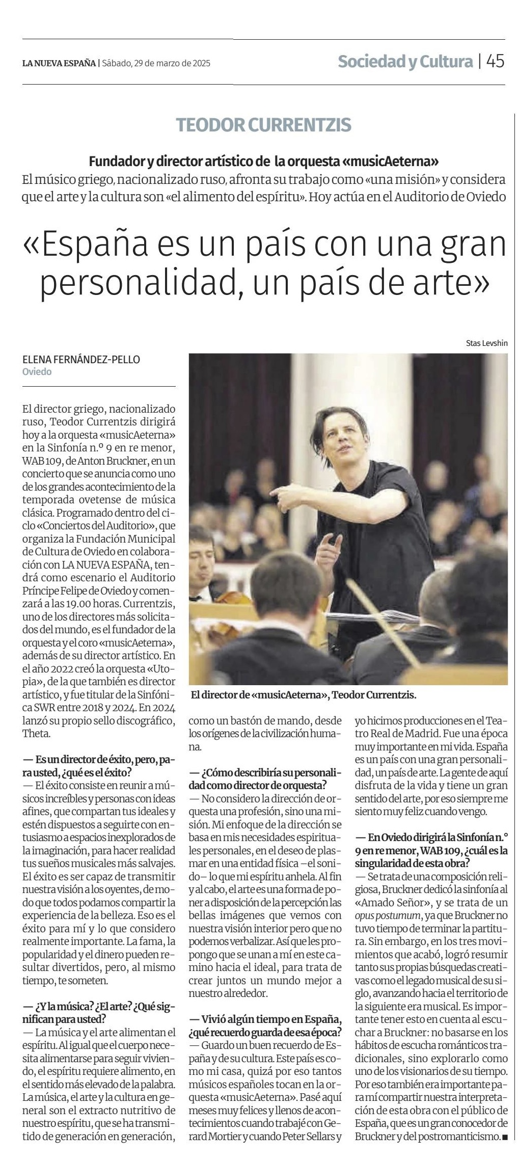 Oviedo sigue siendo «La Viena Española» y está en el mapa de las grandes giras como esta del aclamado Teodor Currentzis (Atenas, 21 de febrero de 1972) con una de sus dos orquestas: musicAeterna (la otra (Utopía) tras Barcelona y Madrid, contando con precios que pueden parecer altos (67€ y 59€ frente a los 148€, 122€ hasta 42€ en el Auditorio Nacional de la capital), pero que son asequibles incluso para melómanos venidos de todas partes, optando por este concierto carbayón antes que en la capital de España donde los hoteles están encareciendo y ahuyentando a tantos buenos aficionados que se acercan al Auditorio Príncipe Felipe y pernoctan en nuestra tierra, demostrando que apostar por la música y optar a Capital Europea de la Cultura en 2031 es siempre una inversión.