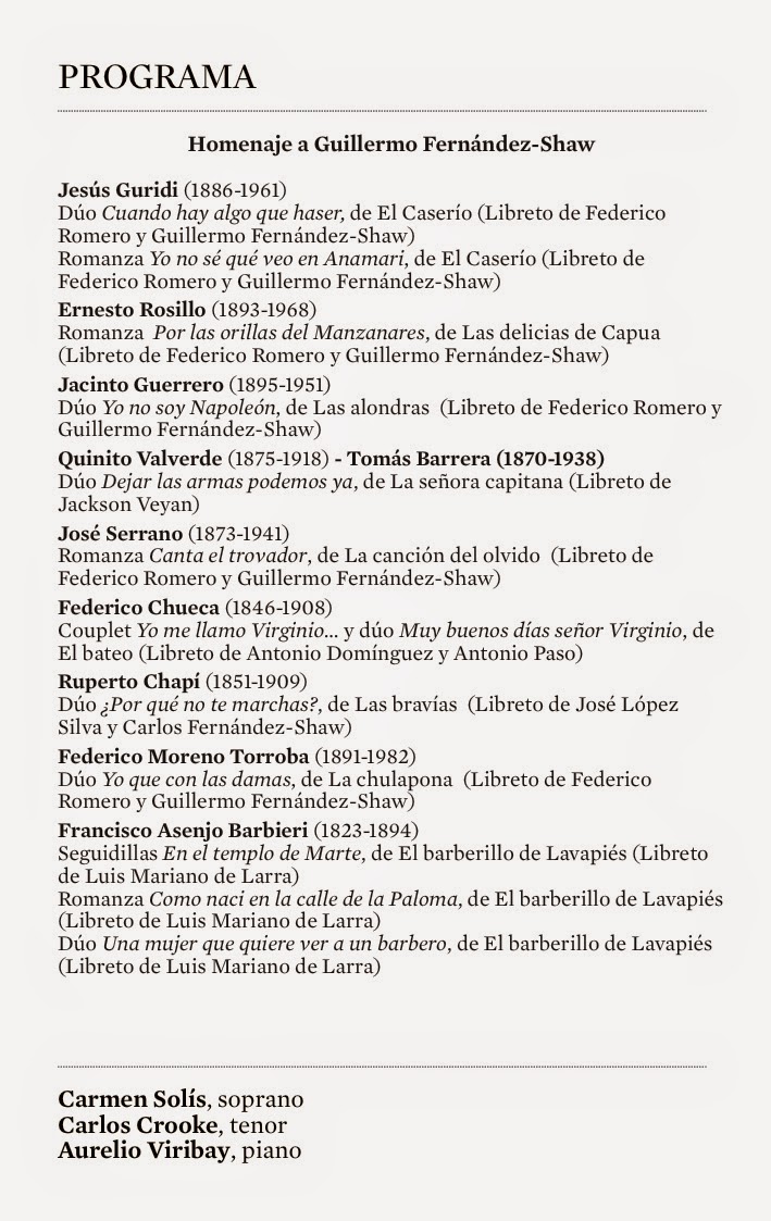 Sábado 16 de mayo, 12:00 horas. Fundación Juan March (Madrid): Los conciertos del sábado. Ciclo «Zarzuela cómica«: Homenaje a Guillermo Fernández-Shaw (1893-1965). Carmen Solís (soprano), Carlos Crooke (tenor cómico), Aurelio Viribay (piano). Entrada gratuita.