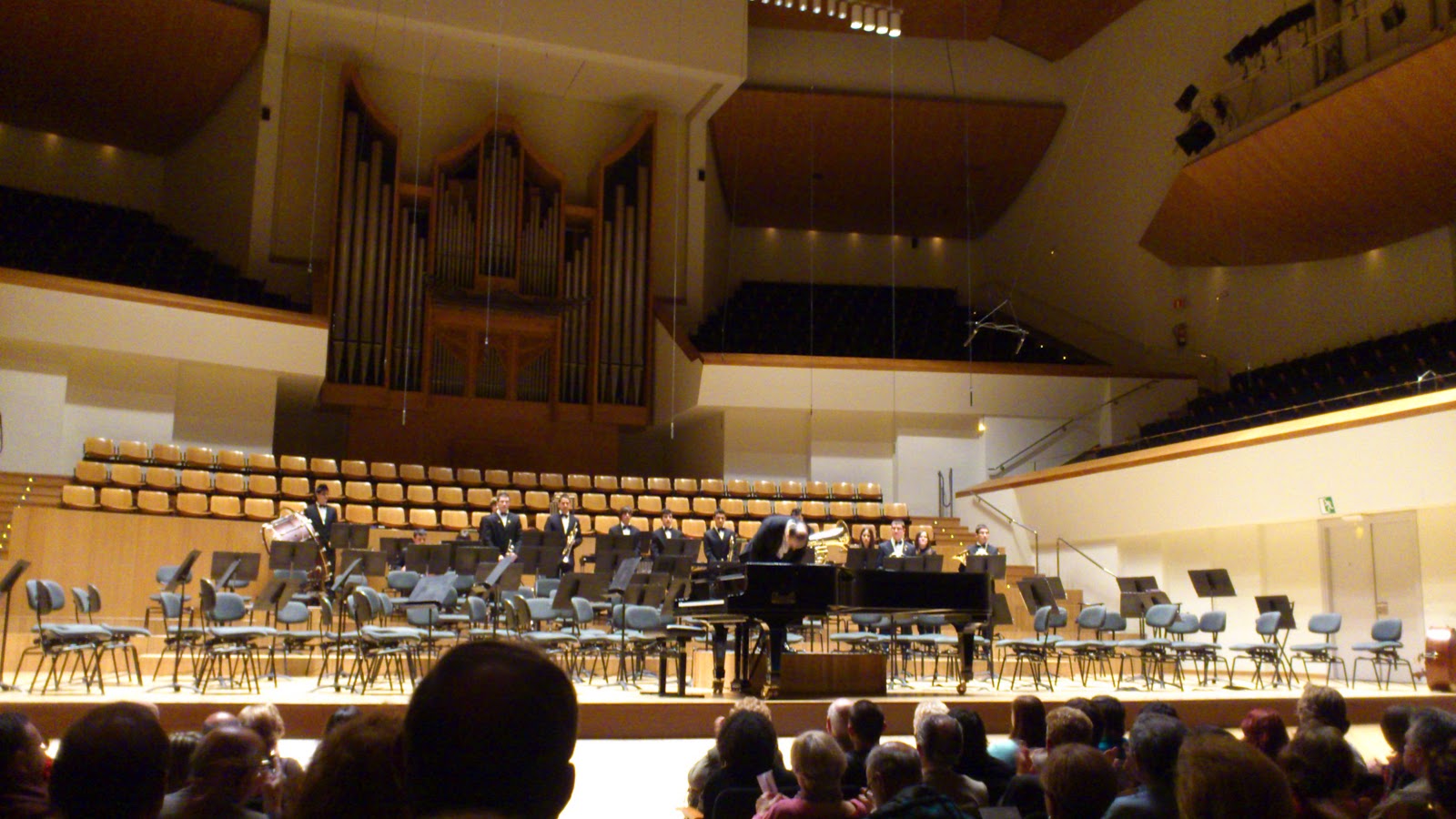 Ni una silla libre aunque se irían vaciando porque algunos curiosos no podían (o no querían escucharlo completo), y unas interpretaciones verdaderamente encomiables con una acústica al aire libre que ayudó a disfrutar de obras comprometidas para una gran formación en un repertorio diría que de banda sinfónica aunque no haya cuerda grave en la plantilla, contando con unos arreglos muy trabajados. Bravo por la clarinete y concertino, pero también los diferentes solistas de oboe, trompeta, saxo tenor… más un cuarteto de percusión solvente (bravo las láminas), mandando y siguiendo en cada momento al maestro López Carreño que dirigiría de memoria la hora larga de un programa titulado «Influencias de ida y vuelta entre el este y el oeste».