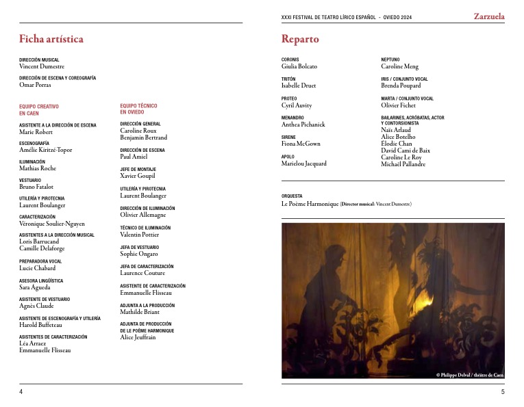 Con todos estos mimbres y sin entrar en el argumento amoroso de las fábulas del XVII y XVIII done dioses, ninfas y héroes eran los galanes y damas de comedia, esta zarzuela sin partes habladas también tuvo guiños a la actualidad como el torero rematando al tritón que causaron su gracia al igual que el duelo “de género” entre Menandro y Sirene, o la entrada de ambos personajes en la segunda jornada (acto) por el patio de butacas hablando en francés antes de la “humorada” del “tengo la camisa negra” en un castellano más que aceptable que ya quisieran muchos funcionase a la inversa. La calidad vocal e interpretativa desde el actor y bailarín David Cami de Baix incluso antes de comenzar saludando bajo el sobre telón, hasta el conjunto vocal simpático, bien empastado y formado donde estaban el tenor Olivier Fichet y la mezzo Brenda Poupard en los personajes de Marta e Iris respectivamente tejieron parte del éxito global.