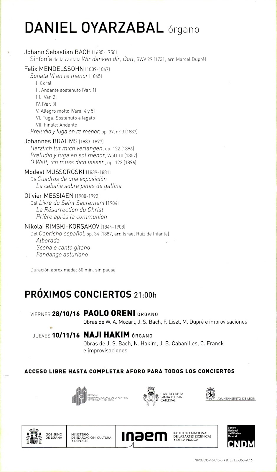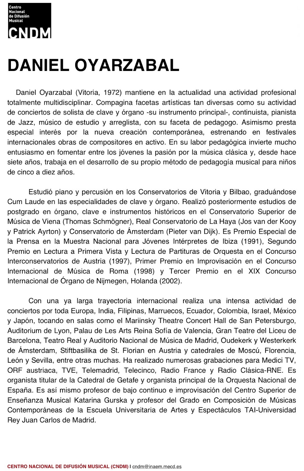 Volvería «solo ante el peligro» Daniel Oyarzábal al clave, primero con el Preludio y fuga en do mayor BWV 870 (del segundo libro de El Clave bien temperado), rico en ornamentos, bien fraseado el preludio y clara, además de precisa la fuga, para rebosar de virtuosismo con el Preludio en si menor BWV 923 (que sustituyó, con buen criterio, al programado Preludio y fuga en re menor BWV 875), un salto cualitativo de un Daniel pletórico que igual nos impresiona al órgano que exprime cada clave que le dejan, «un seguro de vida artístico» como le ha definido mi querido Luis Suñén, y Bach siempre es único en sus interpretaciones.