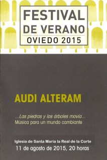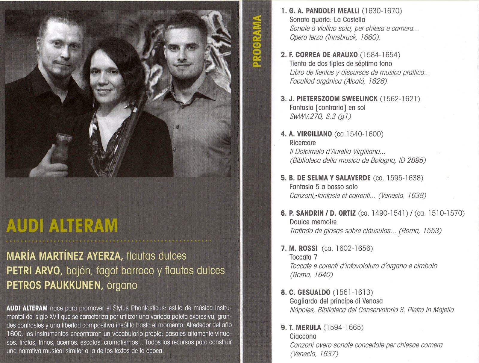 Martes 11 de agosto, 20:00 horas. Iglesia de Sta. María la Real de la Corte. Festival de Verano Oviedo 2015: AUDI ALTERAM: María Martínez Ayerza (flautas), Petri Arvo (bajón y flautas), Petros Paukkunen (órgano). Obras de Giovanni Antonio Pandolfi Mealli, Francisco Correa de Arauxo, Jan Pieterszoon Sweelinck, Aurelio Virgiliano, Bartolomeo de Selma y Salaverde, Pierre Regnault Sandrín / Diego Ortiz, Michelangelo Rossi, Carlo Gesualdo y Tarquinio Merula. Entrada libre.