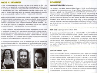 Variados compositores para un concierto de autores variados comenzando por la Sonata quarta: La Castella de Pandolfi Mealli, una «sonate à violino solo, per chiesa e camera» de tres movimientos donde aparecen los contrastes antes mencionados, en versión para órgano y dos flautas en subidas y bajadas dialogadas con solos intermedios de la tecla desde registros similares capaces de confundir a oídos inexpertos, para seguir con nuestro Correa de Arauxo y su Tiento de dos tiples de séptimo tono básicamente flautas, arreglo para órgano y flautín antes de la incorporación de la segunda flauta contralto al final de esta obra con tintes virtuosos rica en disonancias, como la mayoría de formas elegidas, .