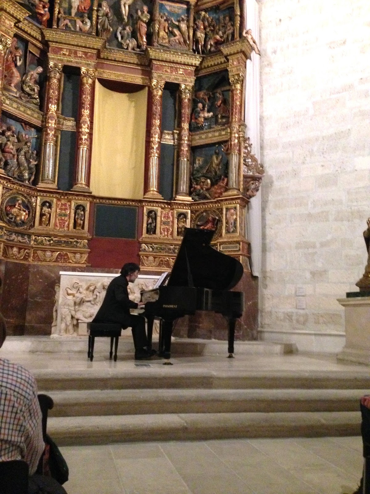 Presencia entre el público del compositor Francisco García Álvarez, de amigos y familiares del propio Diego venidos de todas partes hasta este rincón a la vera de «El Conventín«, de melómanos como mi querido asturiano Florentino convertido desde Burgos al «dieguismo pianístico», también colegas como Luis Vázquez del Fresno, otro gran defensor de la música de nuestro tiempo tanto en la interpretación como desde su faceta de compositor, y un salón de actos que se llenó incluso con público de pie al completarse el aforo. El entorno lo merecía, el intérprete y la música lo engalanaron.