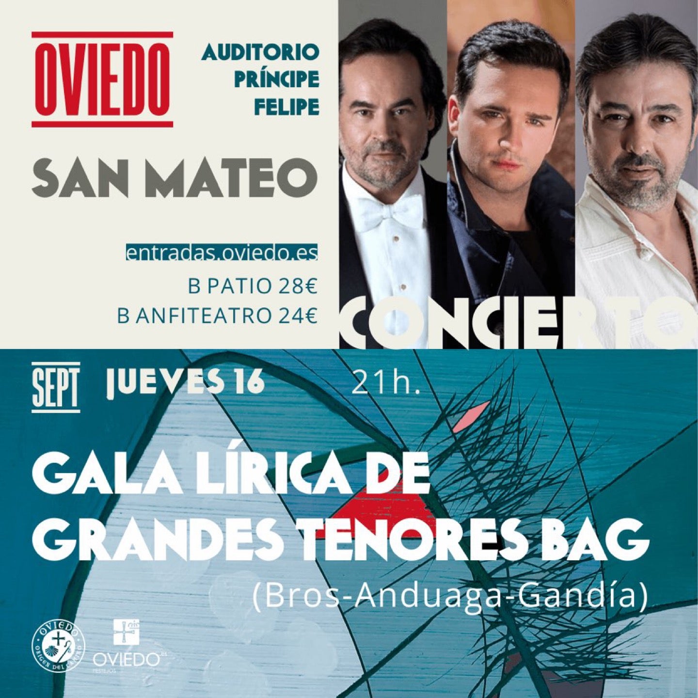 Jueves 16 de septiembre de 2021, 21:00 horas. Auditorio Príncipe Felipe: SAN MATEO 2021, GALA LÍRICA DE GRANDES TENORES BAG (BROS-ANDUAGA-GANDÍA). José Bros, Antonio Gandía y Xabier Anduaga, Oviedo Filarmonía, Jaume Santonja (director).