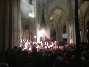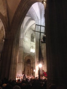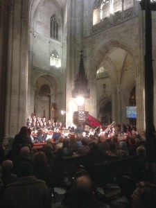 Aún con la neblina asturbritánica en el aire y tormentas instrumentales, los contrastes brillantes «marca de la casa» nos llevarían a escuchar la bellísima y animada The Virgin Queen – Bobbing Joe de John Playford, virtuosismo en la tecla de Aarón, en el violín casi whistle y más fiddle que nunca de Jorge, los rasgueos de Pablo empujando y reforzando el ritmo discreto y necesario de Pedro que haría de campanero para la siguiente declamación, con el tenor sentado al borde del escenario, la renacentista Al alva venid del Cancionero de Palacio, la profesionalidad de proyectar la voz en todas las direcciones para degustar estas melodías que impregnaron el aire frío que se olvidó con la calidez y calidad alrededor de una imaginada pinta de buena cerveza.