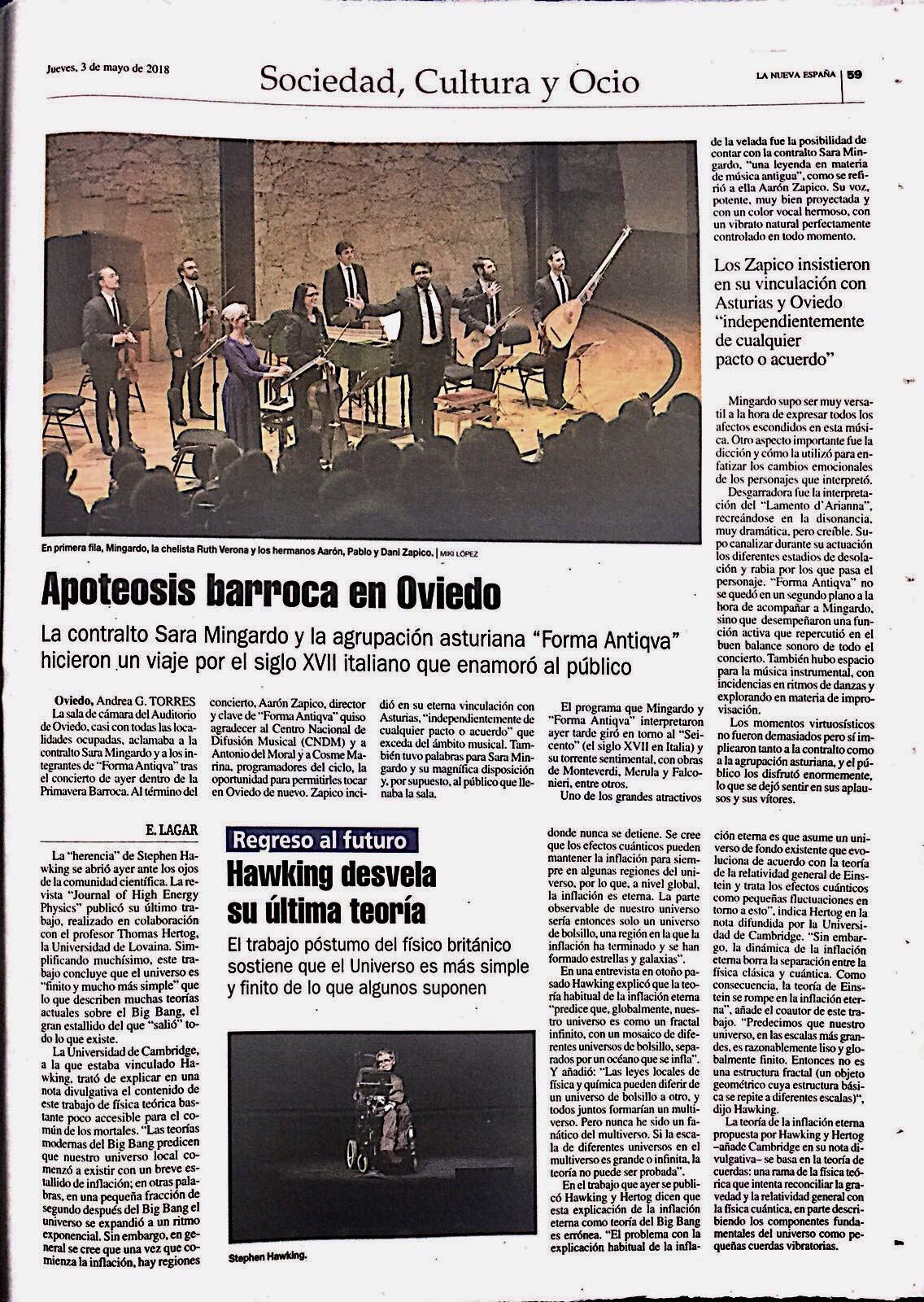 Aarón Zapico agradecía el apoyo y confianza en ellos depositada por quienes siguen creyendo en sus proyectos, a los que han estado siempre a su lado en esta sólida carrera que despegaba hace veinte años en Sama con su padre Eloy siempre en el recuerdo. Comentó finalmente que el programa era osado, valiente, lleno de sorpresas, y así fue sin defraudar en ningún momento. El conjunto dio juego tanto solo como acompañando a la leyenda italiana, dando una verdadera lección de canto, un bis del primer Falconieri siempre distinto, del que confesó fue la primera obra aprendida, despidiéndose con la perspectiva y madurez que da una carrera como la suya, dejándonos una paleta de colores para vestir toda la gama emocional y pureza de la contralto junto a estos acompañantes.