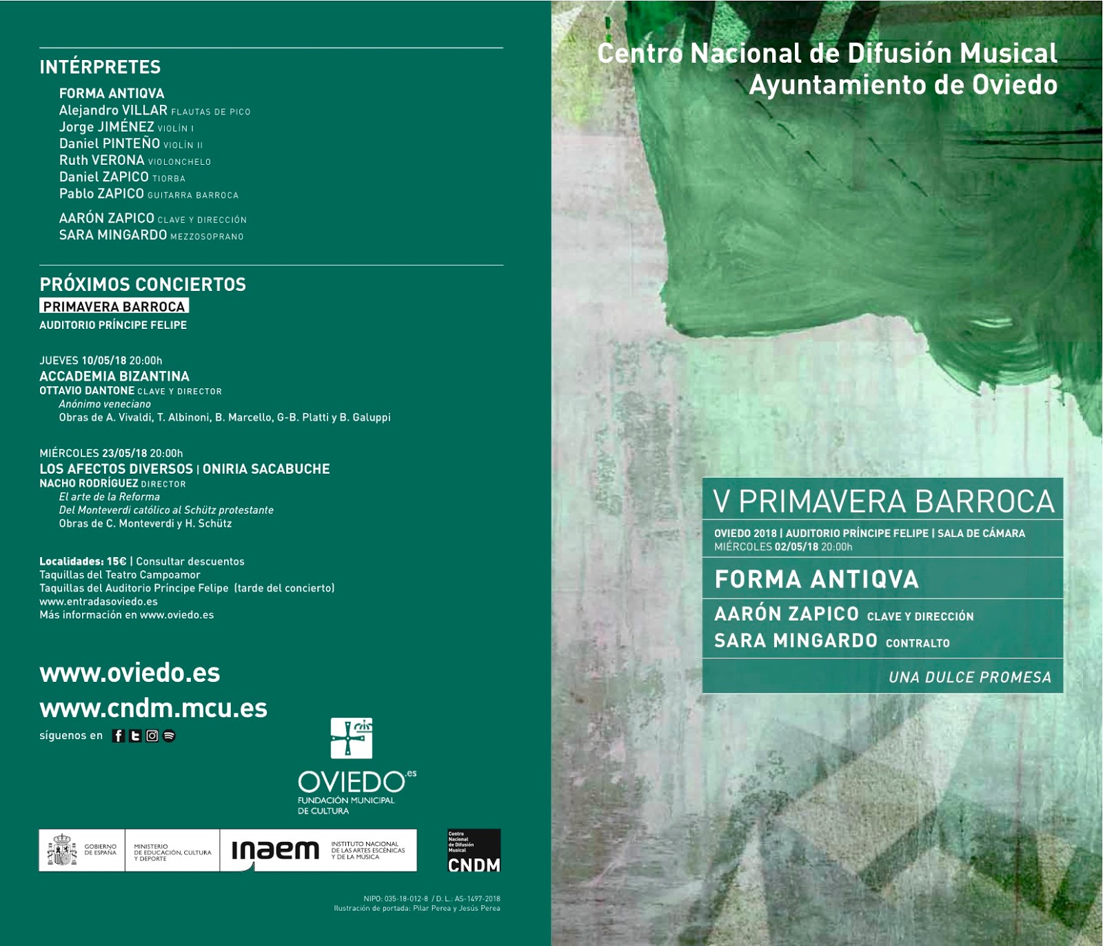 Miércoles 2 de mayo, 20:00 horas. Auditorio de Oviedo, sala de cámara, V Primavera Barroca: Sara Mingardo (contralto), Forma Antiqva, Aarón Zapico (clave y dirección): “Una dulce promesa”, obras del Seicento italiano. CNDM, Fundación Municipal de Cultura.