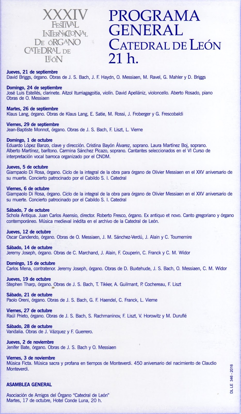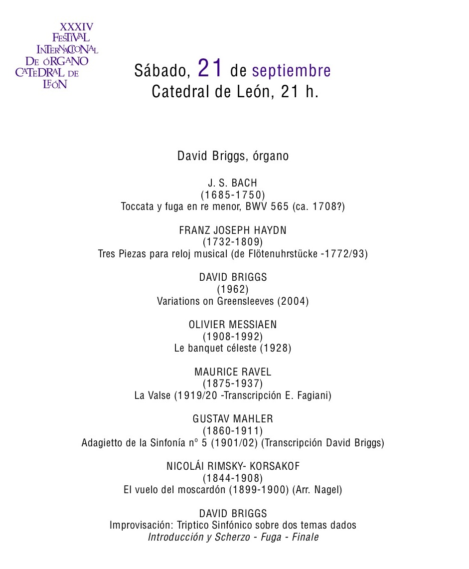 La Toccata, adagio y fuga en do mayor, BWV 564 (ca. 1708) de J. S. Bach resume a la perfección el ideario o mapa musical de este peregrinaje organístico en León que arrancaba en la lejana Alemania luterana: la toccata virtuosa, vertiginosa y limpia, jugando con la acústica catedralicia con registros bien diferenciados «pisando fuerte» en ese teclado bajo que volvería a sorprendernos al final, interrumpido por un público que no tenía el programa a mano, siguiendo el adagio, lento, reposado, bien articulado y ornamentado con esa bellísima melodía en un registro de lengüetería flotando por tímbrica más que dinámica, casi mecida por mano izquierda y pies cual contrabajos orquestales, para terminar con esa fuga final colorista en compás de 6/8, tres mundos en uno, introspección hacia la explosión, la limpia exposición del motivo que va creciendo, construyendo esa forma matemática hecha música por el rey y dios musical.