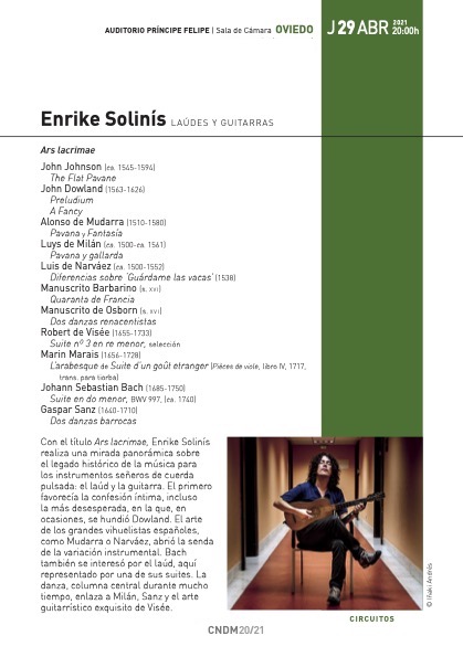Continúa la cultura segura, las ganas de directo y el florecimiento de la Primavera Barroca de Oviedo en esta su octava edición que mantiene la colaboración con el CNDM y sus «Circuitos», trayéndonos en solitario al guitarrista vasco Enrike Solinís (Bilbao, 1974) que hizo un recorrido por la cuerda pulsada a través de la historia antigua desde la óptica actual, con cumbres y cordilleras, ascensos y descensos en un denso programa titulado Ars lachrimae, una panorámica de este personal viaje con mucha cuerda pulsada y todo un legado de la música para dichos instrumentos señeros desde una perspectiva y visión con identidad propia y distintas calidades.