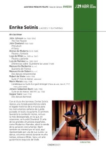 Enrike Solinís retomó el pulso, cogió aire y nos despertó con la vihuela «salvaje», descarada, rítmica y punzante de nuestro Gaspar Sanz, las danzas que siguen siendo seña de identidad del músico vasco y verdadera alegría su interpretación, manteniendo este final en las dos propinas que fueron gratificantes y muy aplaudidas.