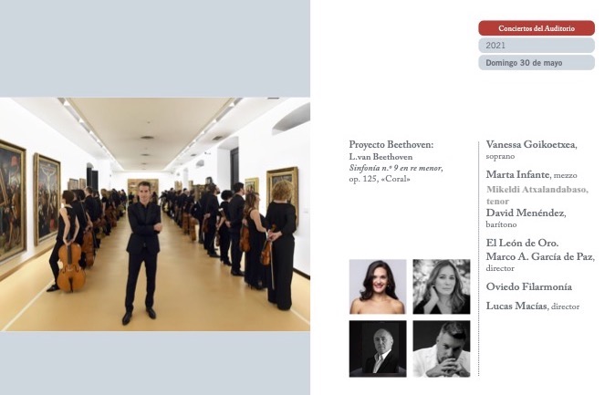 Domingo 30 de mayo, 19:00 horas. Conciertos del Auditorio, Oviedo: Vanessa Goikoetxea (soprano), Marta Infante (mezzosoprano), Mikeldi Atxalandabaso (tenor), David Menéndez (barítono); El León de Oro (director: Marco A. García de Paz), Oviedo Filarmonía, Lucas Macías Navarro (director). Beethoven: Sinfonía nº 9 en re menor, op. 125, «Coral». Entrada butaca: 15 €.
