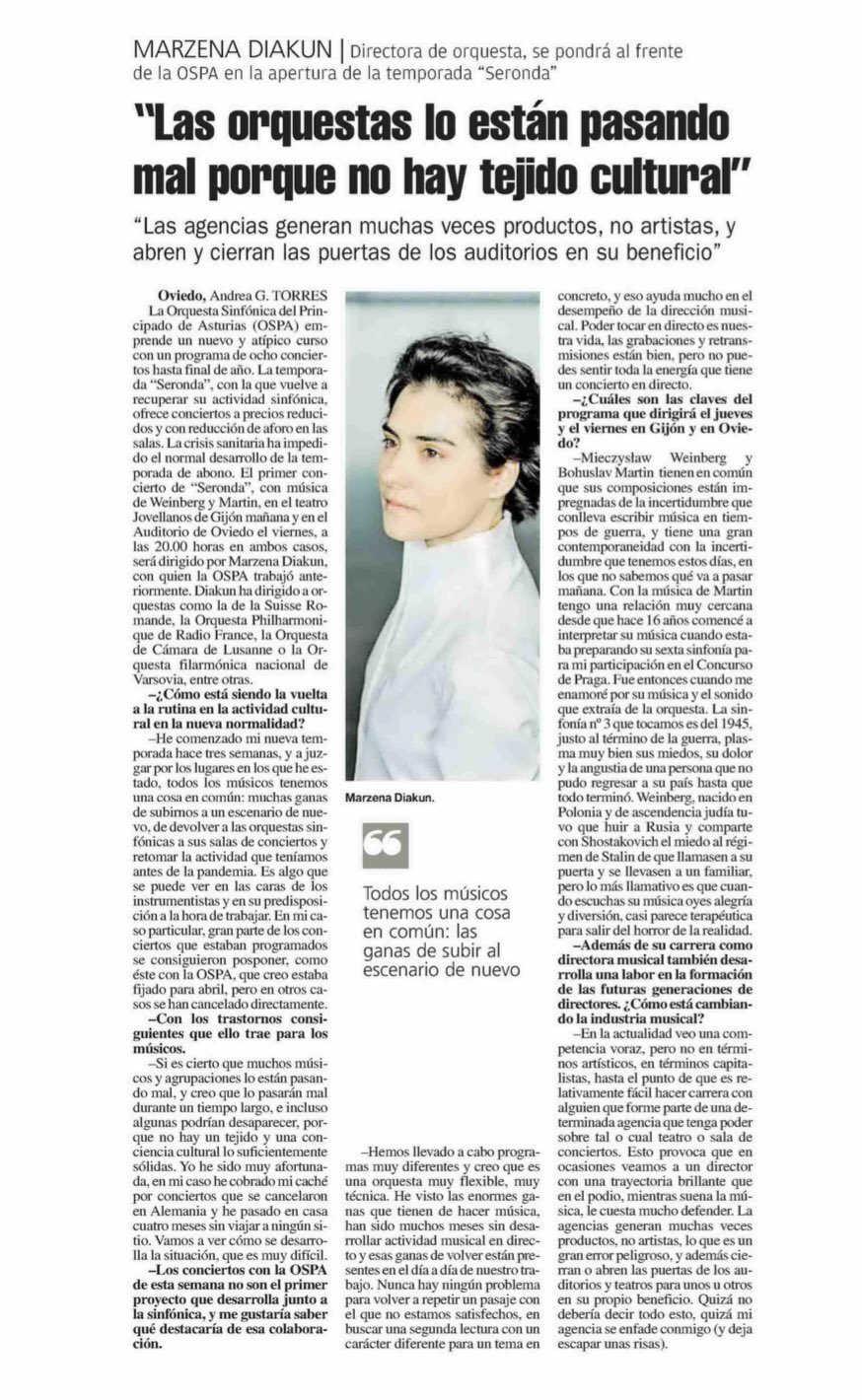 Viernes 18 de septiembre, 20:00 horas. Auditorio de Oviedo, Sala principal. OSPA, Marzena Diakun (directora). Concertino invitada: Mirabai Weismehl. «Seronda», obras de Martinu y Weinberg. Entrada butaca: 15€.