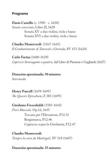 Compositores poco conocidos como Dario Castello, de quien nos dejaron dos sonatas del Libro II (1629) alternando clave y órgano en forma típica en su época, junto al curioso Capriccio Stravaganzza a quatro (1627) de Carlo Farina, donde los instrumentos imitan sonidos de animales con técnicas muy expresivas a base de glisandos, pizicatos, trémolos o dobles cuerdas y los novedosos para entonces sul ponticello o col legno, juegos tímbricos donde los Galantes se mostraron solventes además de preciosistas.
