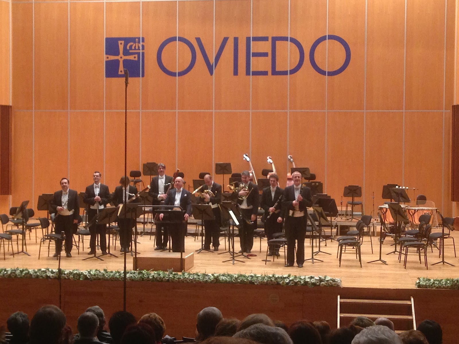 Con el trasiego necesario en escena para la siguientre obra, enmarcada en la llamada «Harmoniemusik» (de la que nos habló Rogelio Álvarez en la conferencia previa) y finalmente el descanso que no sabíamos si vendría aquí, apareció el octeto de viento que podemos contemplar en las fotos, con el maestro suizo al frente, personalmente innecesario por la formación camerística pero igualmente artífice del excelente resultado de esta Serenata nº 12 en Do m., KV. 388 (Mozart), como espoleados por la «transfiguración» anterior y demostrando nuevamente el nivel de excelencia también en la sección de viento asturiana: Ferriol y Romero, Mascarell y Falcone, Andreas y Daniel, Morató y Rosado fueron desgranando los cuatro movimientos escritos con la maestría, dificultad y precisión del genio de Salzburgo, y un Bamert sin batuta mimándolos cual coro de cámara, empastes de cañas dobles, muestrario de combinaciones de cuatro a dos, con las trompas ensambladas como una -puntualmente algo fuertes- y clarinetes buscando equipararse a los oboes en presencia, todo un juego de excelencia donde el peso recayó en Juan Ferriol que sigue asombrando por su excelencia en todas sus intervenciones. Una maravilla mozartiana descubierta por muchos aficionados y colocada entre Arnold y el bueno de Franz, aunque la música de cámara con los solistas de la OSPA debería estar en otra programación.